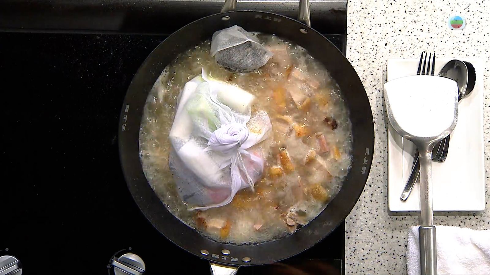 4.肉骨茶香料置袋。爆香燒腩逼出油分,加大約800毫升水,放入肉骨茶香料袋,以大火再次滾起後,放入調味料及雞蛋煮約15分鐘。
