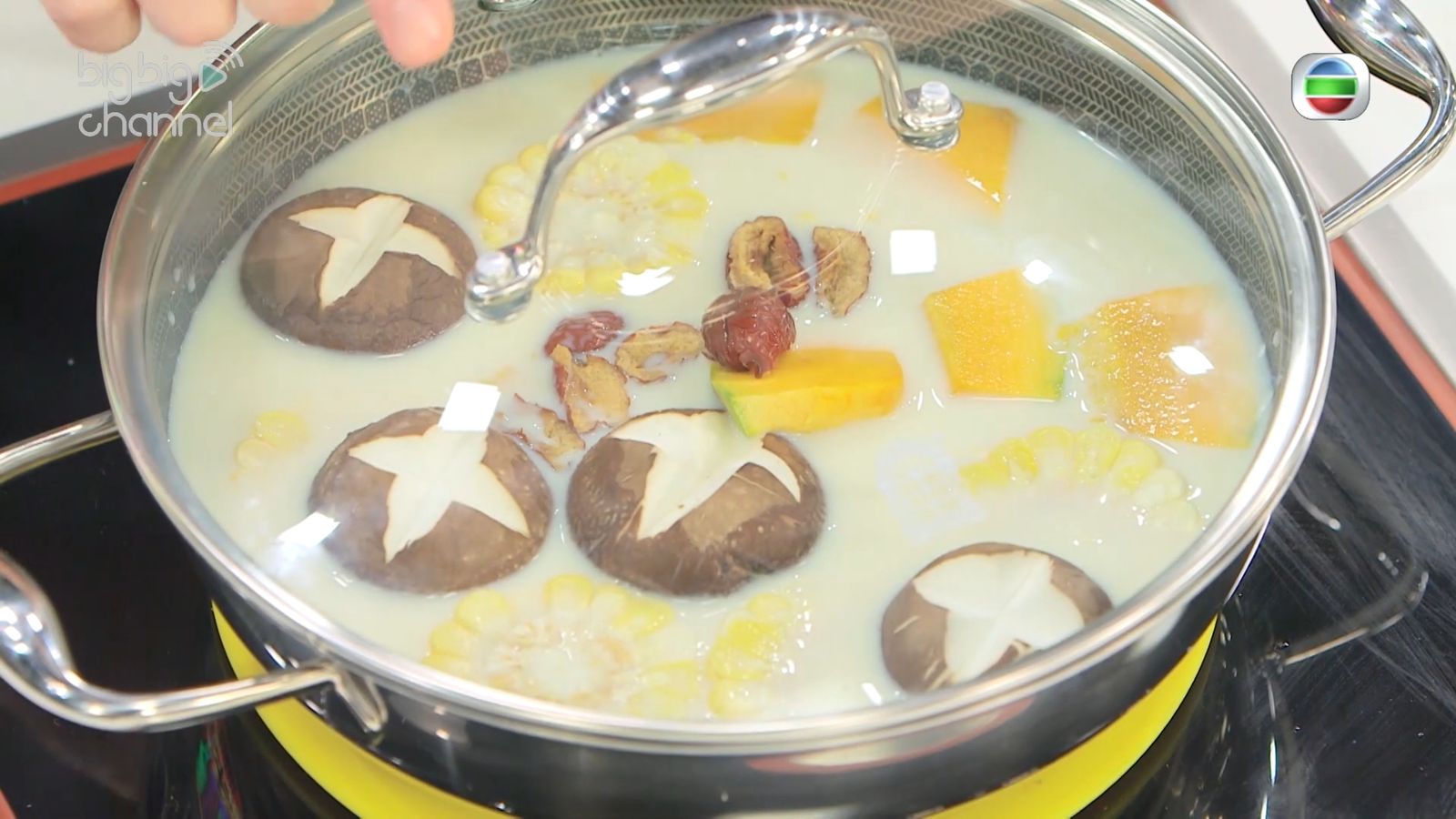 - 豆乳放鍋內以中火加熱,放進鮮冬菇、粟米、南瓜片及豆腐粒煮滾。