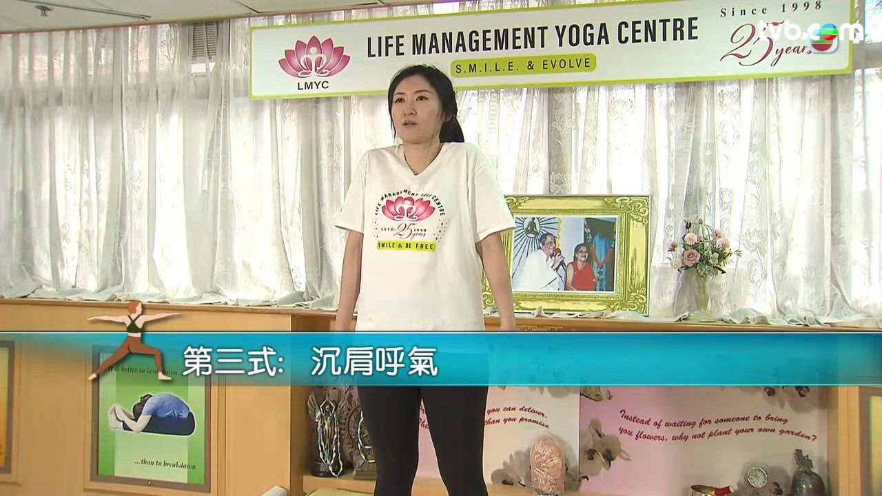 - 呼氣時,肩膊向下沉,重覆成套動作3至5次