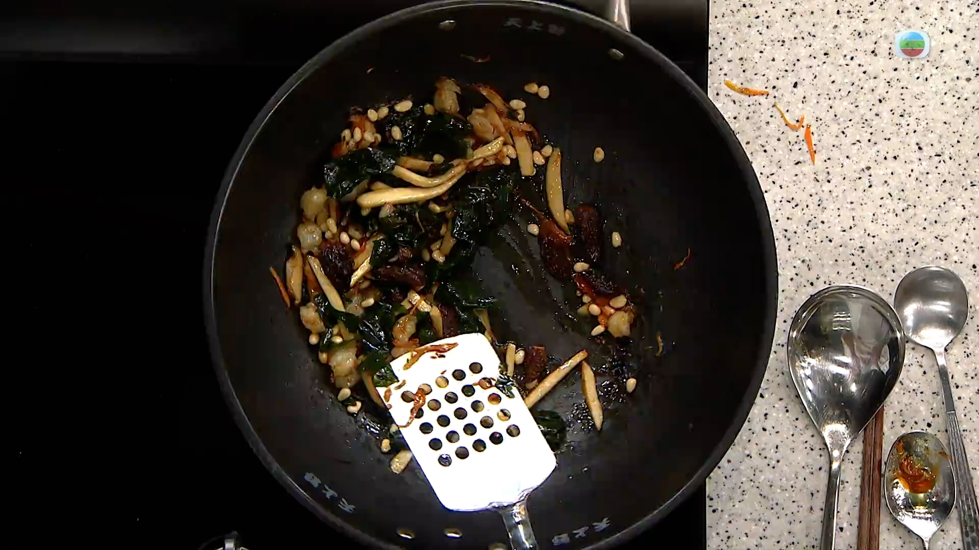 1.雞髀菇、甘筍、蝦仁、羊肚菌下油鍋炒香,下鹽,灒酒,加入蠔油、松子仁炒勻,關火,下昆布炒合成餡料,盛起備用。