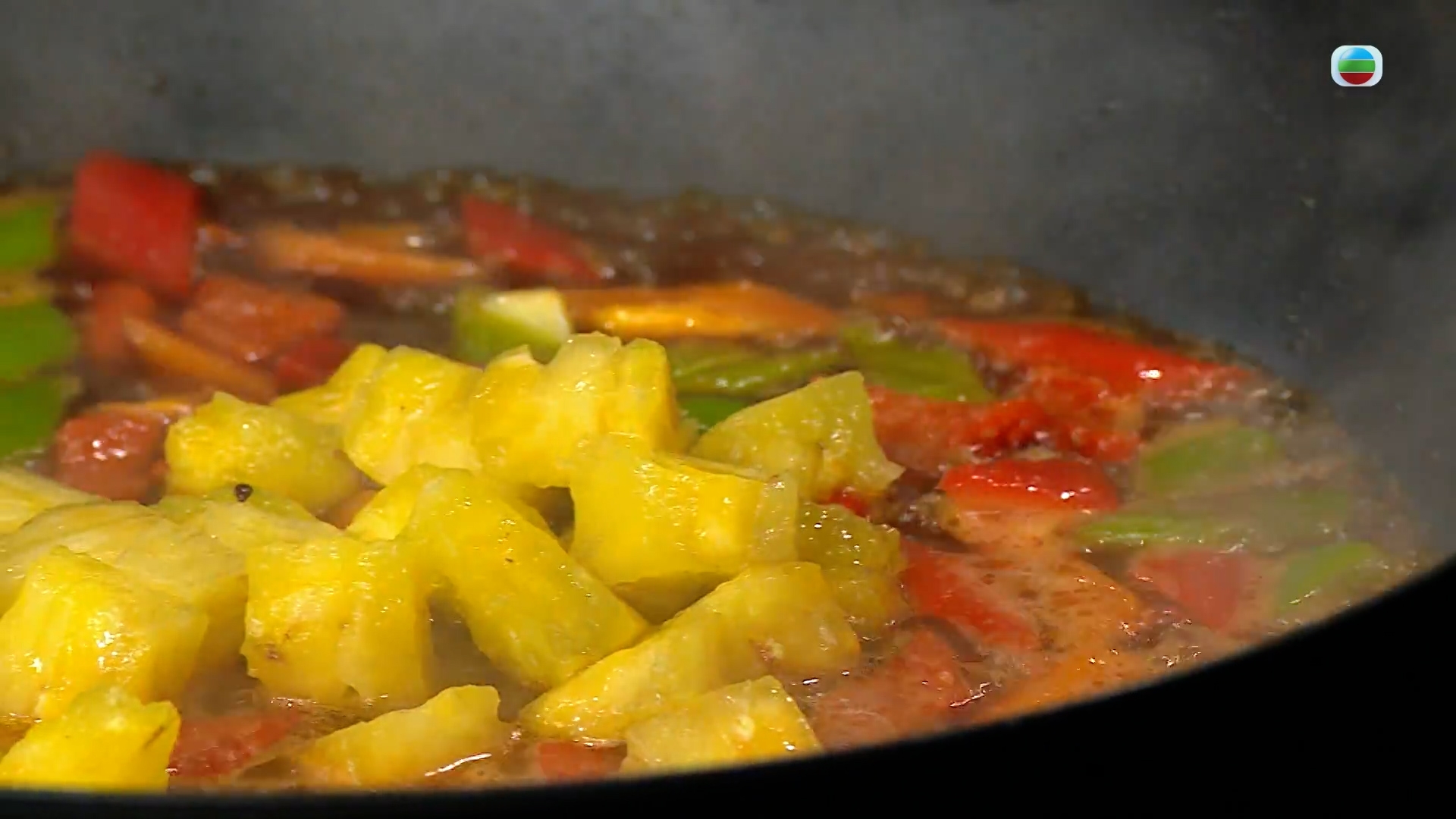 咕嚕汁的做法是先把青紅椒粒略炒,再加入水、糖、茄汁、生抽、菠蘿粒、生粉水一起煮黏稠即成。