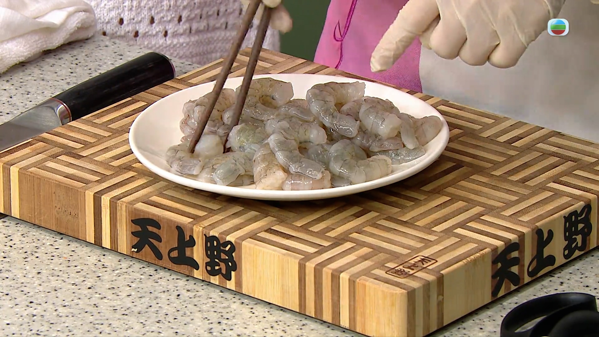 1.蝦膠略拍後剁勻,下調味料拌勻,備用。