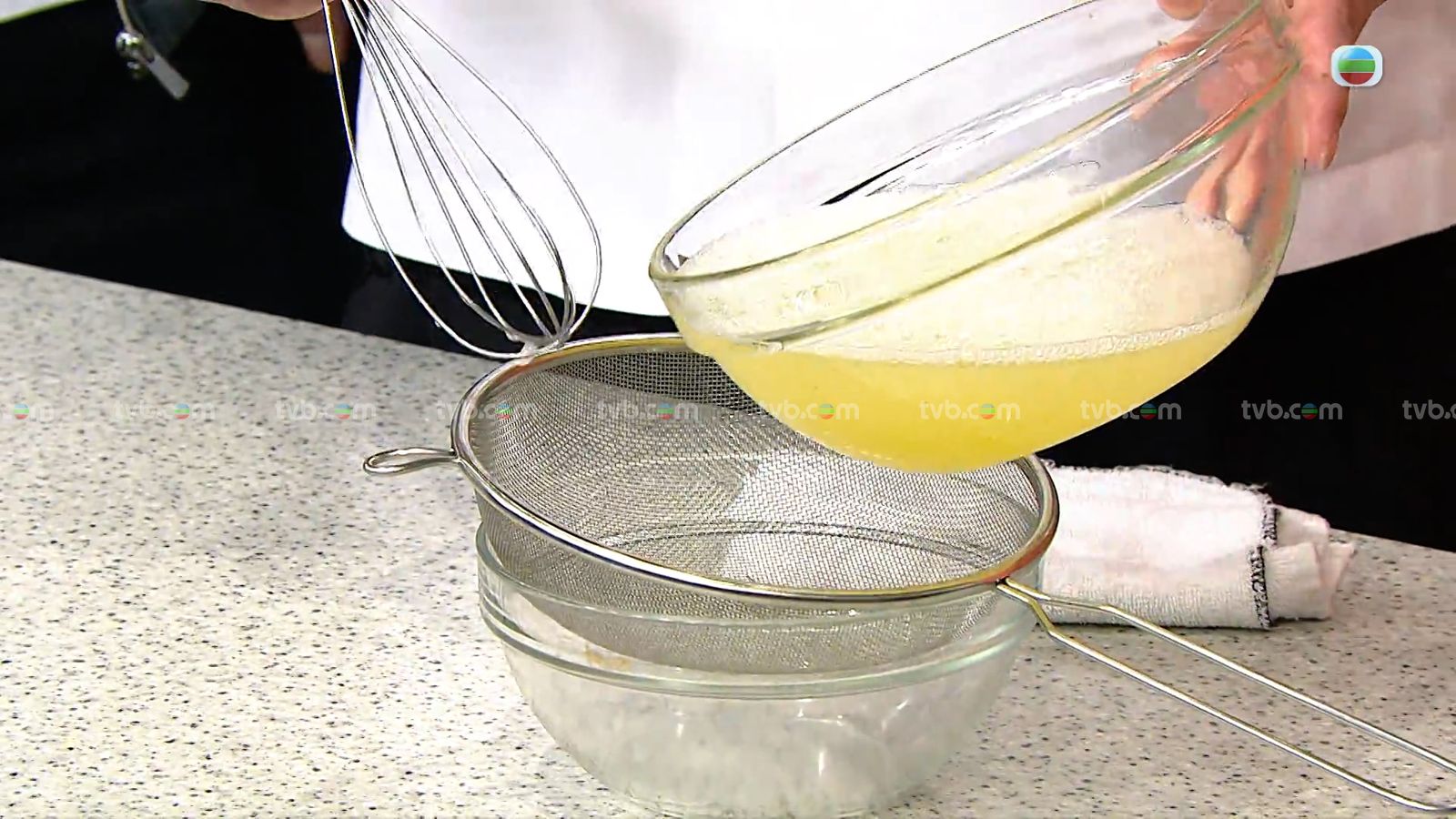 準備6隻蛋左右份量的蛋白,將高湯與蛋白以2:1比例混合,加鹽、糖拌勻後過篩備用,盡量不要打起泡。