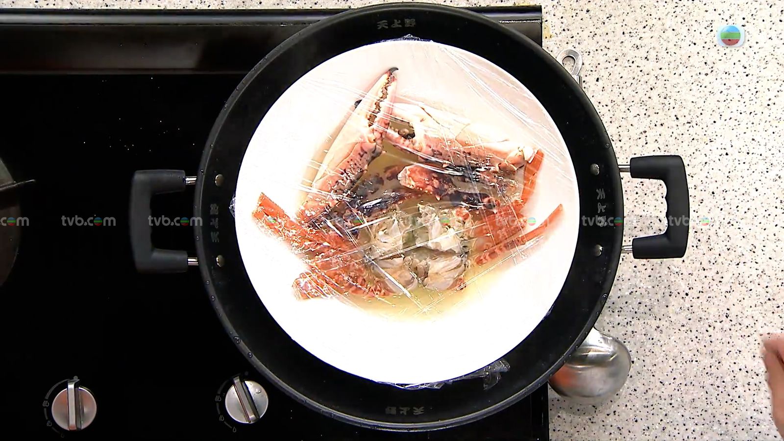 把除蟹蓋以外的蟹件備在碟上,倒入高湯蛋白混合液後包保鮮紙蒸8分鐘,再去掉保鮮紙放上蟹蓋再蒸5分鐘。
