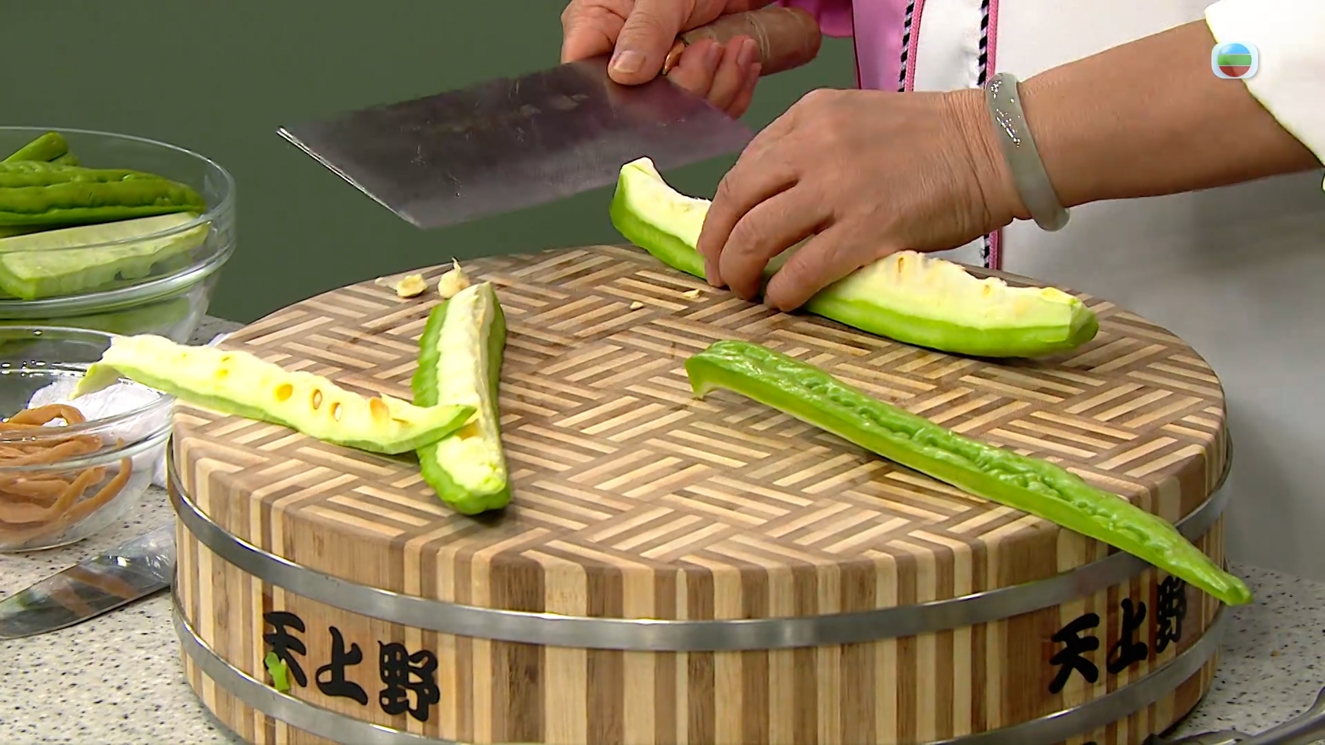 臨近過節,三姐示範一道過節餸「涼瓜海參燜一字排」。涼瓜(苦瓜)不一定用雷公鑿,去掉失瓤並將其切成長條形即可。