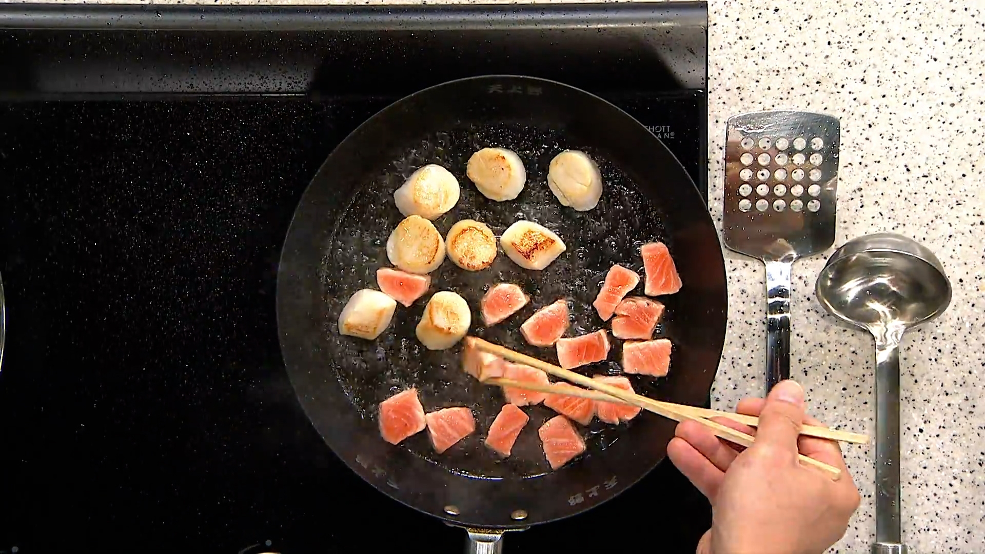 三文魚和帆立貝不需要調味,下油鍋煎至兩面金黃即可,然後蔬菜鋪底屠,然後鋪海鮮,最後淋上茶湯汁,灑上櫻花蝦及紫菜碎點綴就完成了。