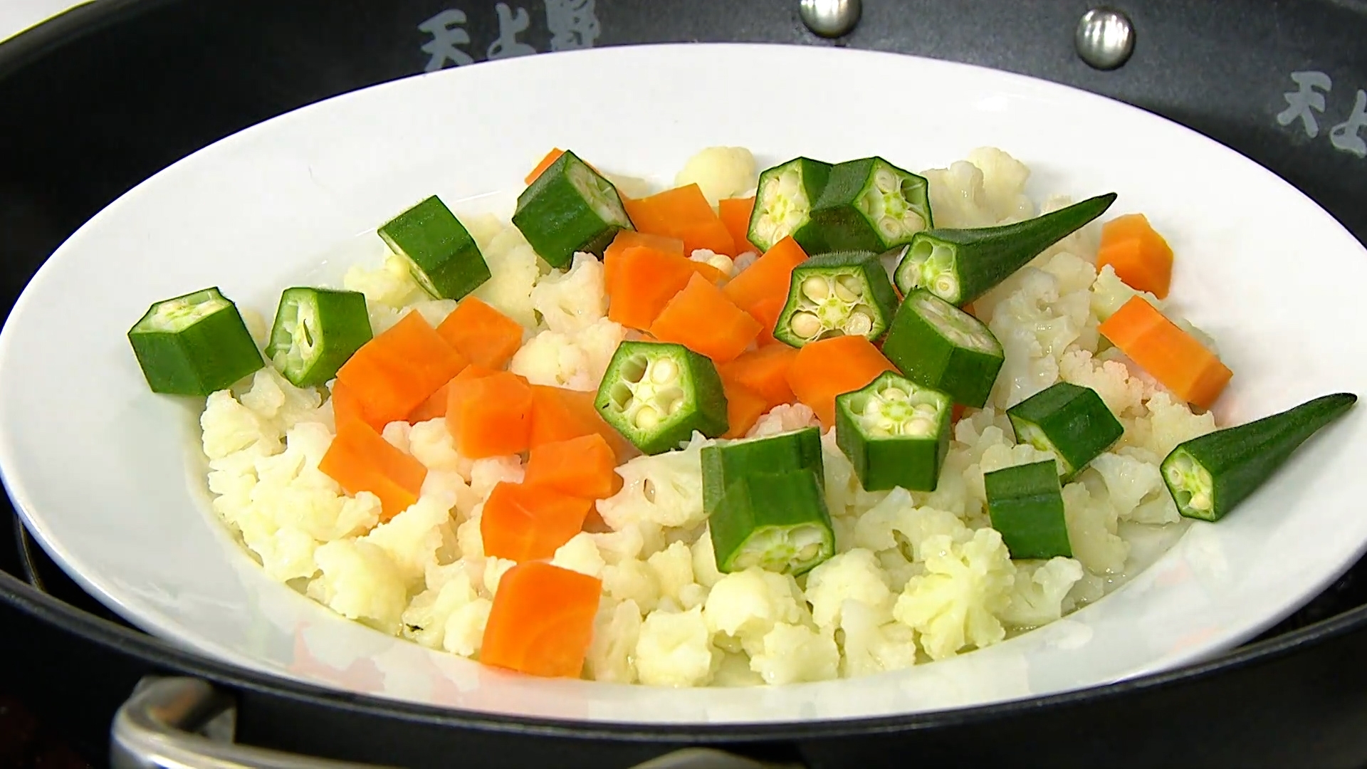 2.椰菜花及甘筍放碟上,隔水蒸8分鐘後,加入秋葵多蒸2分鐘,置於湯碗底。