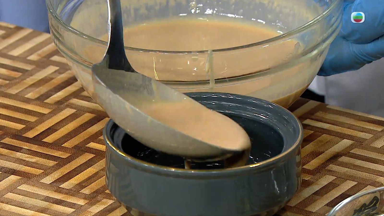 2.鵝肝加少許水搓散後隔渣,加入蛋白調味,蒸8分鐘後放涼,再加(1)雞蛋水,用保鮮紙蓋好後再蒸5分鐘。
