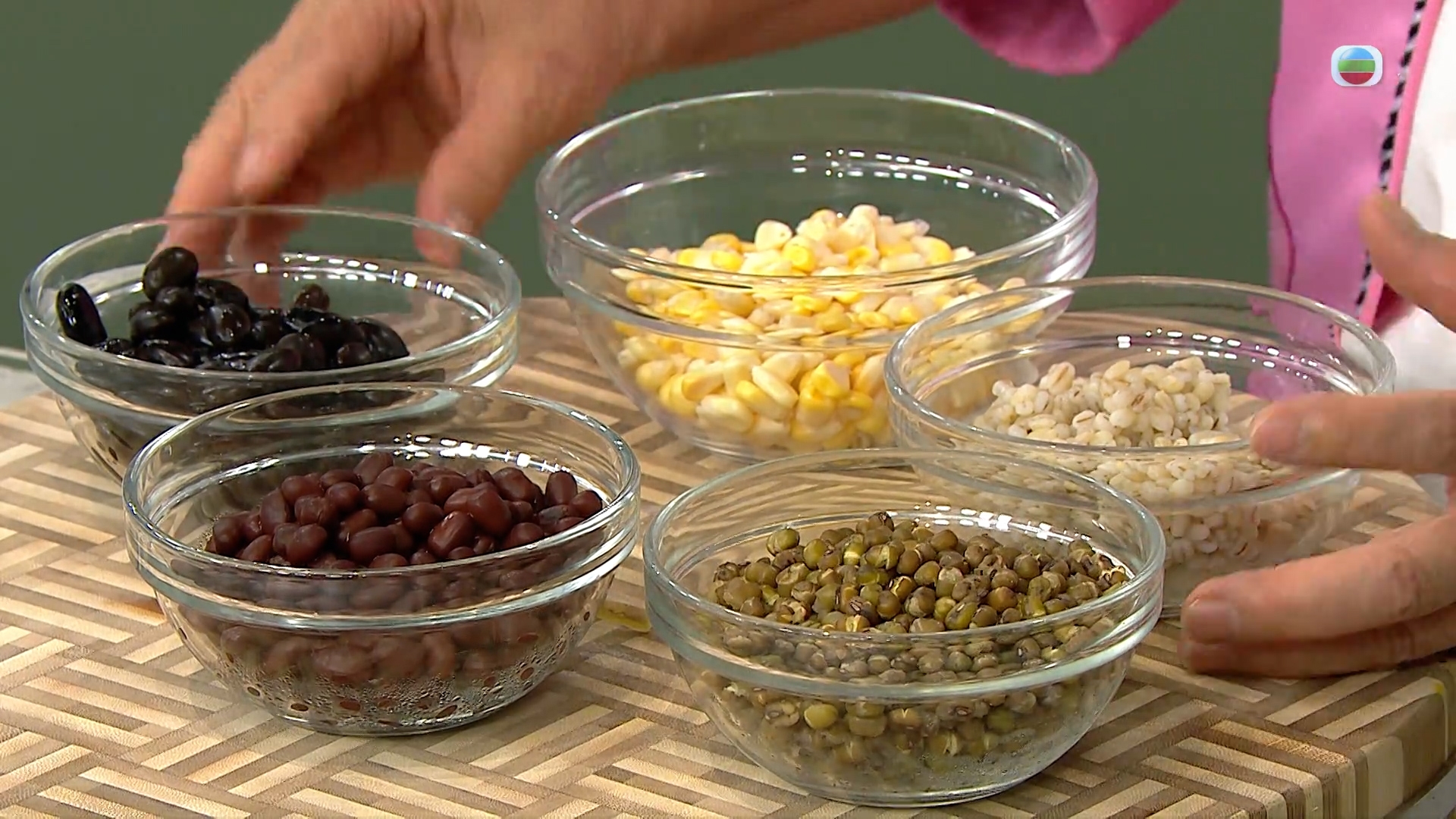 五色豆包括粟米、紅豆、黑豆、綠豆和洋薏米,需要事先浸一晚然後隔水加鹽、糖蒸約20分鐘備用。把五色豆倒入煮熱的火腿湯,加入蠔油和麻油調味炒合,煮滾後加生粉水打成掛汁芡備用。