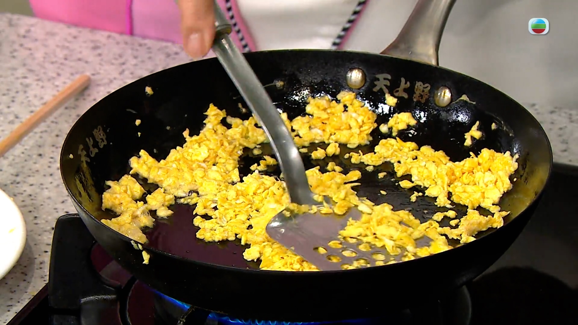 這回三姐一換口味,做一味開胃的有味飯,首先的步驟是炒一碟桂花蛋。重點在於蛋漿裡也要加入少量的油,以確保蛋花更容易散開,並用鍋鏟壓碎壓散。