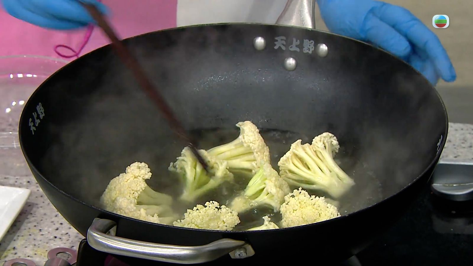 2.椰菜花與西蘭花苗切小件,浸入淡鹽水之中待片刻,隔淨水備用。