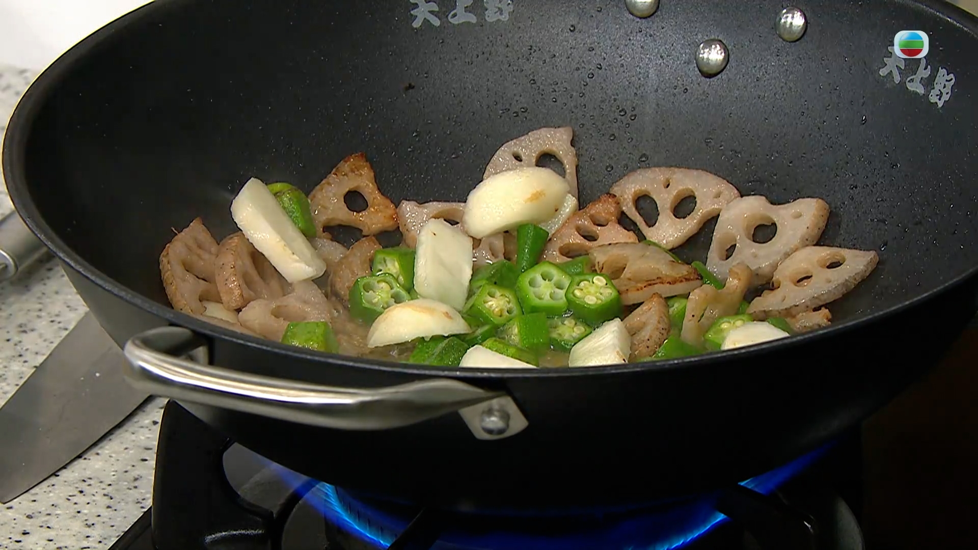 配料方面,Leslie選用秋葵這種低糖高纖的健康食材,切粒以後連蒜片、馬蹄和蓮藕一起大火炒合即可。
