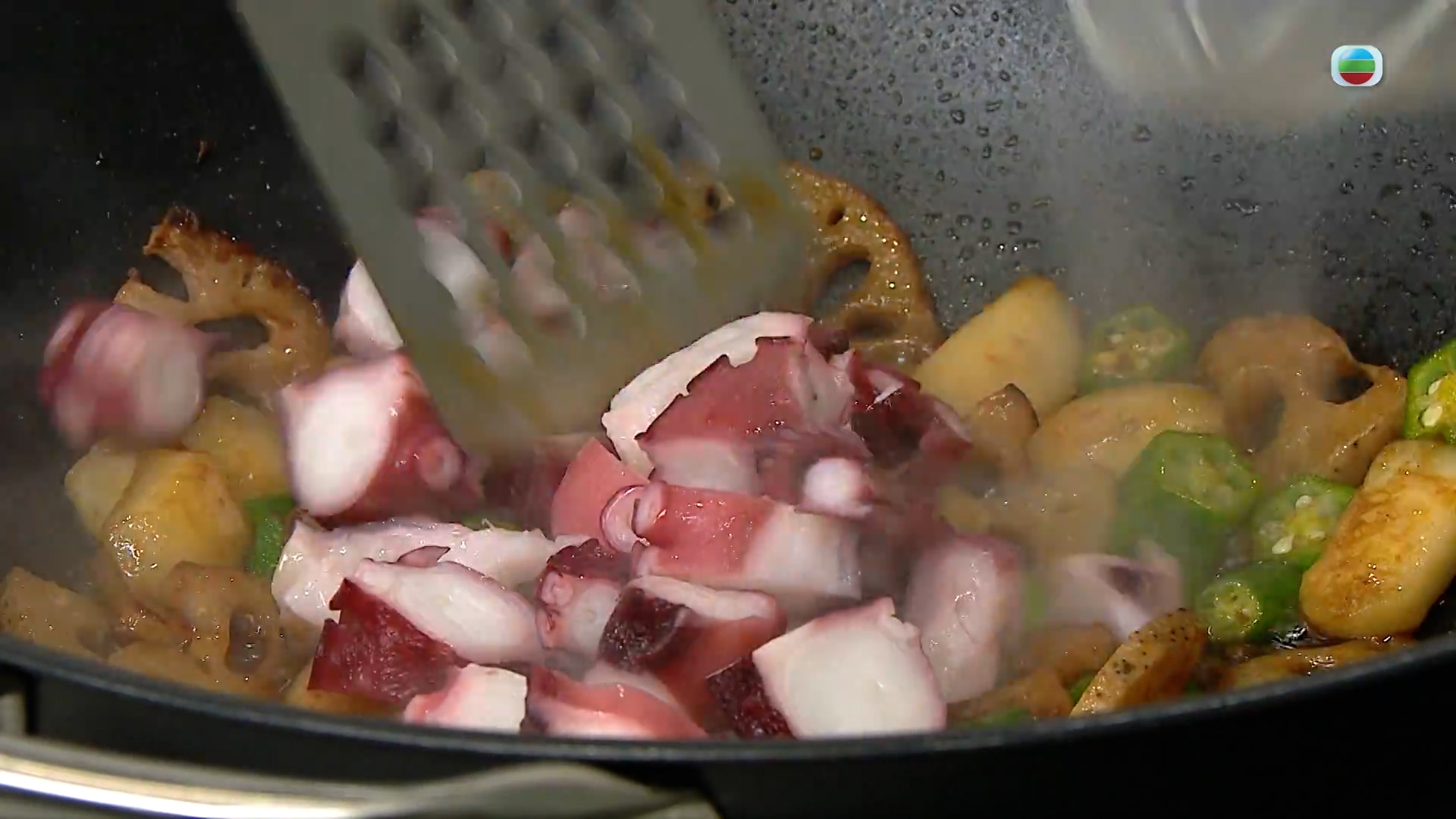 最後加入八爪魚粒兜炒,Leslie建議八爪魚要解凍至常溫,以免受熱不均、烹煮過久,影響口感,秋葵的黏液也在兜炒中起到勾芡的作用。