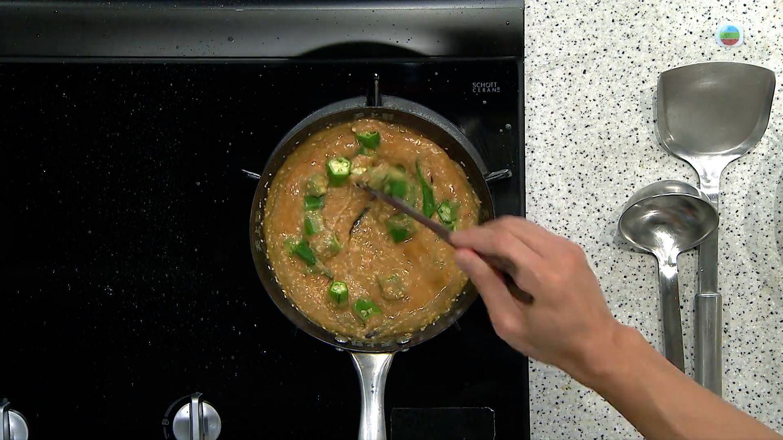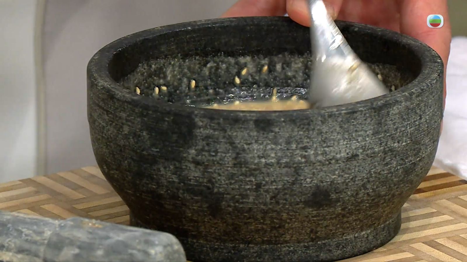 4.芝麻舂碎,混入芝麻醬及水,加生抽、鎮江醋及糖攪勻,再加少許蒜蓉,然後放入鑊內煮熱,再下秋葵。