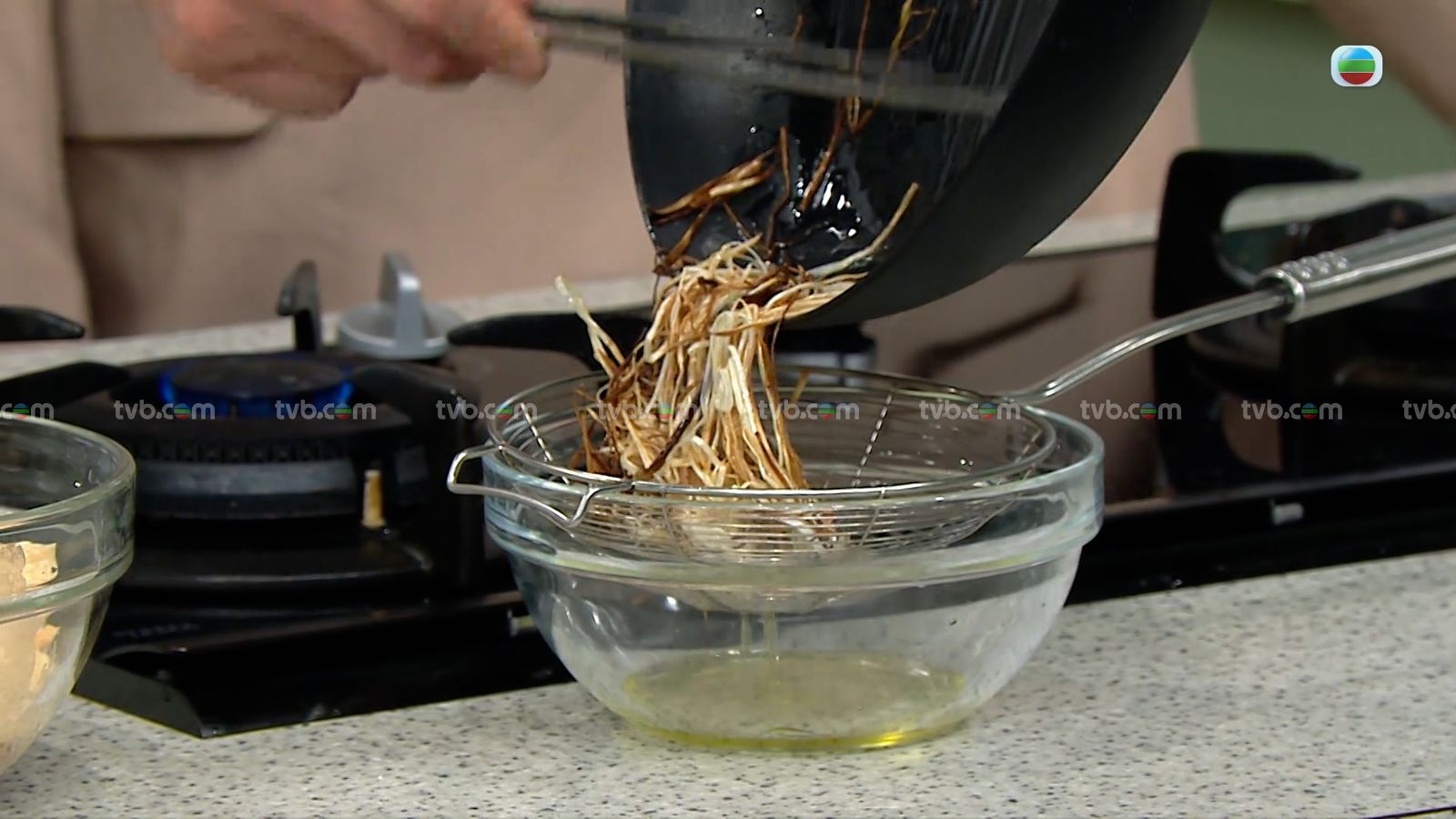 京蔥切絲,下油鍋煎至微焦,隔出蔥油備用。