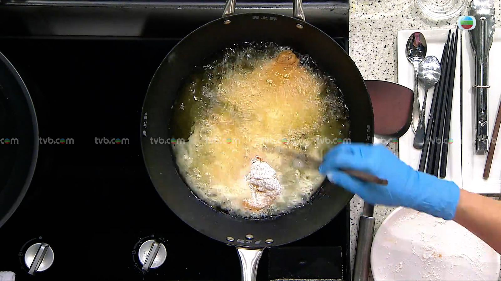 2.豬扒薄薄拍上生粉,下油鍋炸約5分鐘至熟,盛起。