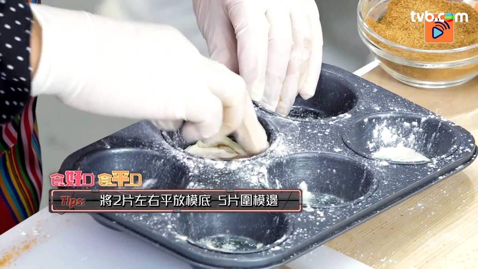 - 將兩片酥皮平放好,按駁位重疊以便黏合,掃上牛油溶液,均勻地灑上(3),將酥皮捲起成條狀,切成約5毫米薄片後輕壓扁,將2片左右平放模底,5-6片圍模邊,用手指輕輕將每片捏合