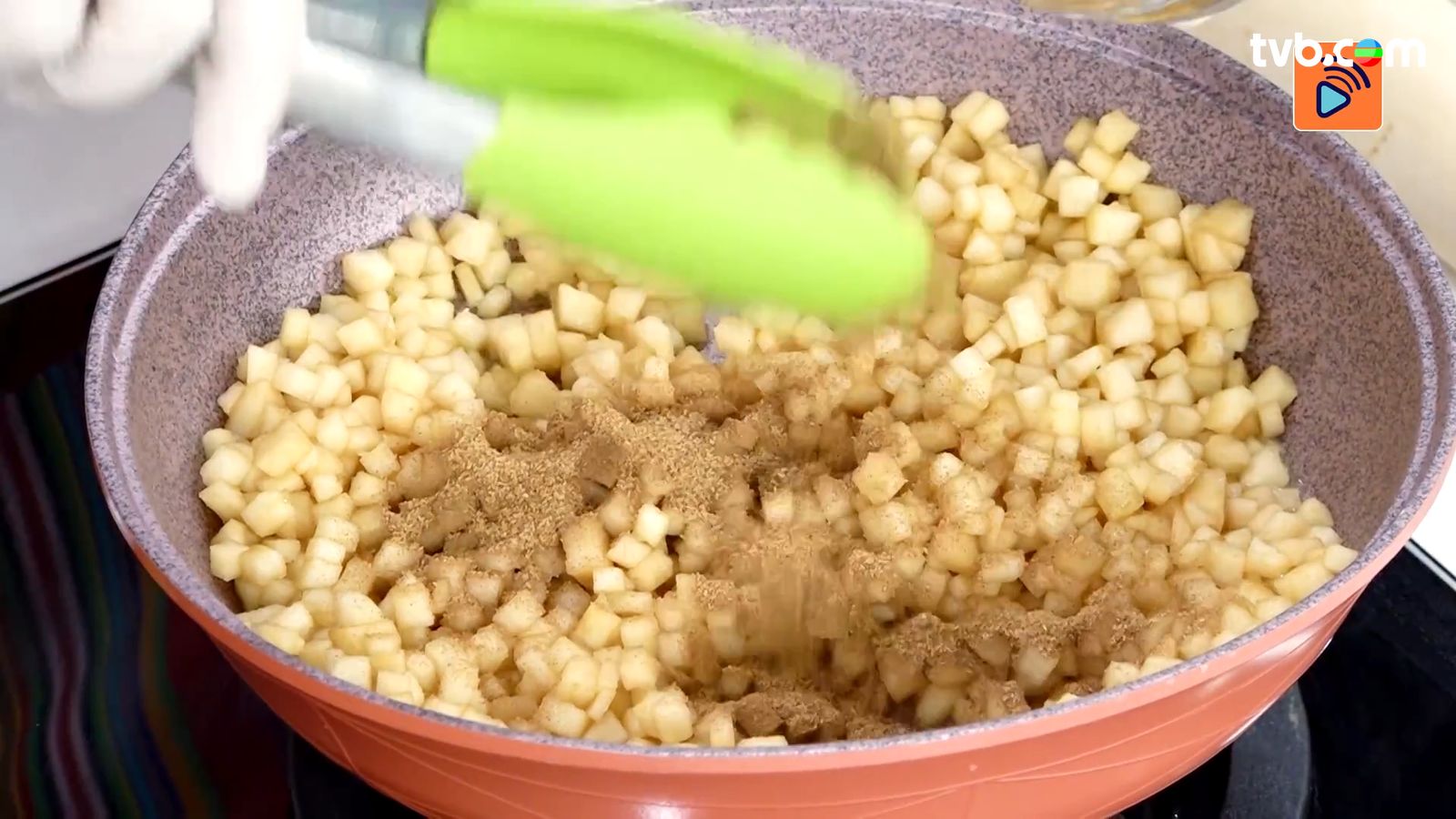 - 小鍋內放入蘋果粒、黃糖、肉桂粉、雲呢拿油煮至糖融,加入青檸汁及皮略煮,再加入麵粉拌勻,放涼備用