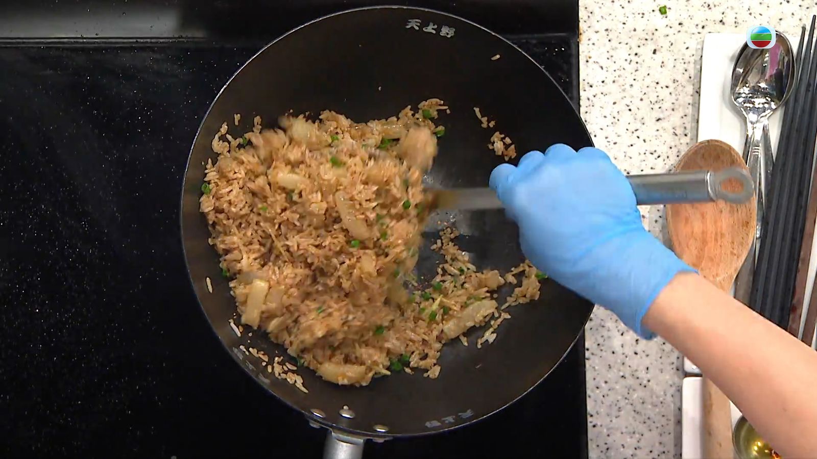 另起油鍋,爆香薑絲,將飯下鍋,加2至3湯匙照燒汁兜炒均勻,再下蔥粒炒勻後上碟。