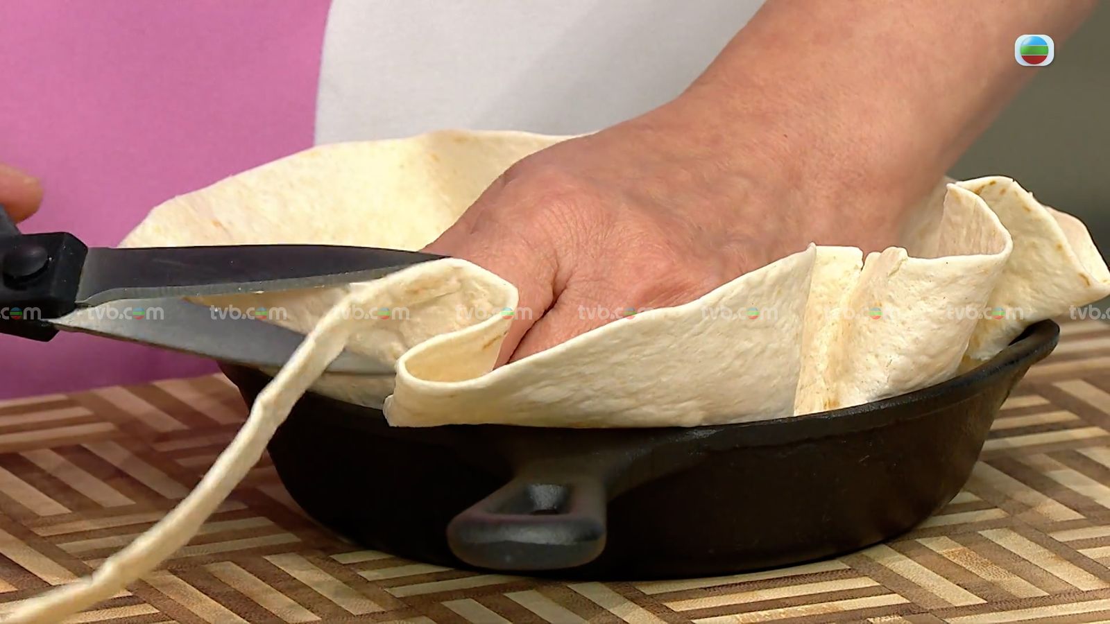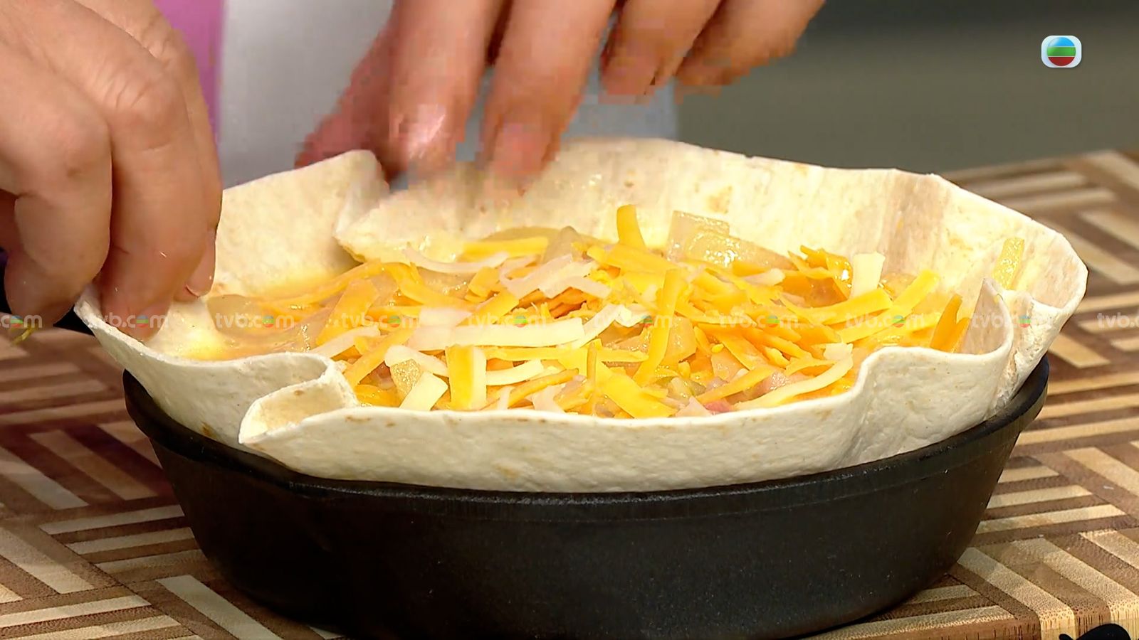這道菜是法國蛋批(Quiche lorraine)的簡易版本,用墨西哥薄餅代替批皮。將薄餅塞進掃上油的焗盤,裁剪好批邊備用。批邊稍為突出焗盤可營造焦脆口感。