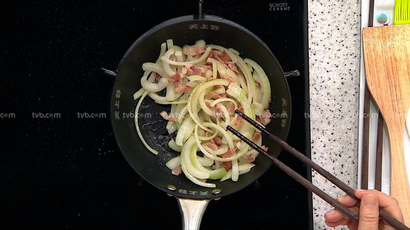 3.煙肉下油鍋炒香,加入洋蔥兜炒至軟身,盛起稍稍放涼,加入已拌勻的蛋液中。