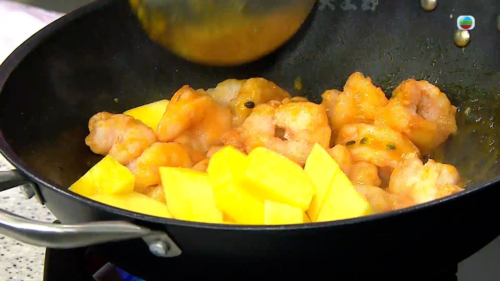 另起油鍋,先下醬汁煮熱,再注入生粉水煮至變稠,然後把蝦球回鍋,放入芒果兜勻就可以盛起置碟。