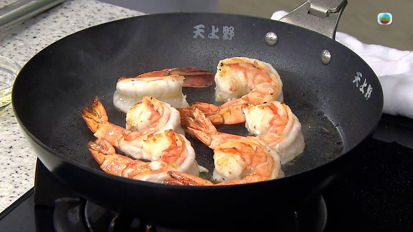 虎蝦去頭去殼留尾,下鹽和黑椒略醃,原鍋煎香兩邊備用。