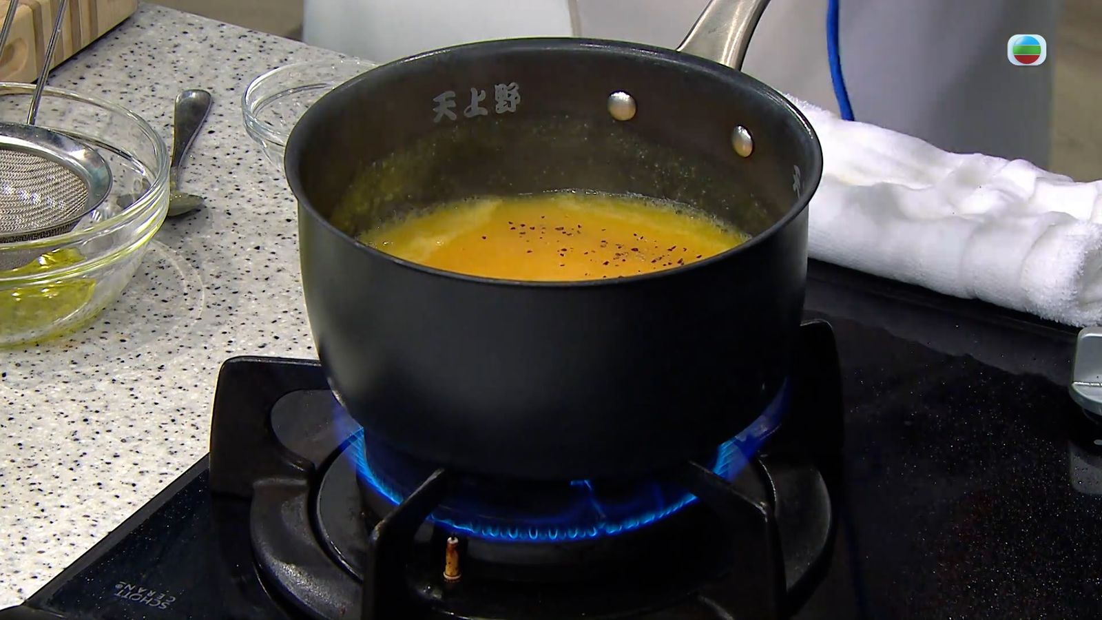 南瓜湯壓濾出湯汁,跟羅勒油混合後下小鍋,加鹽、黑胡椒煮沸後置碟。