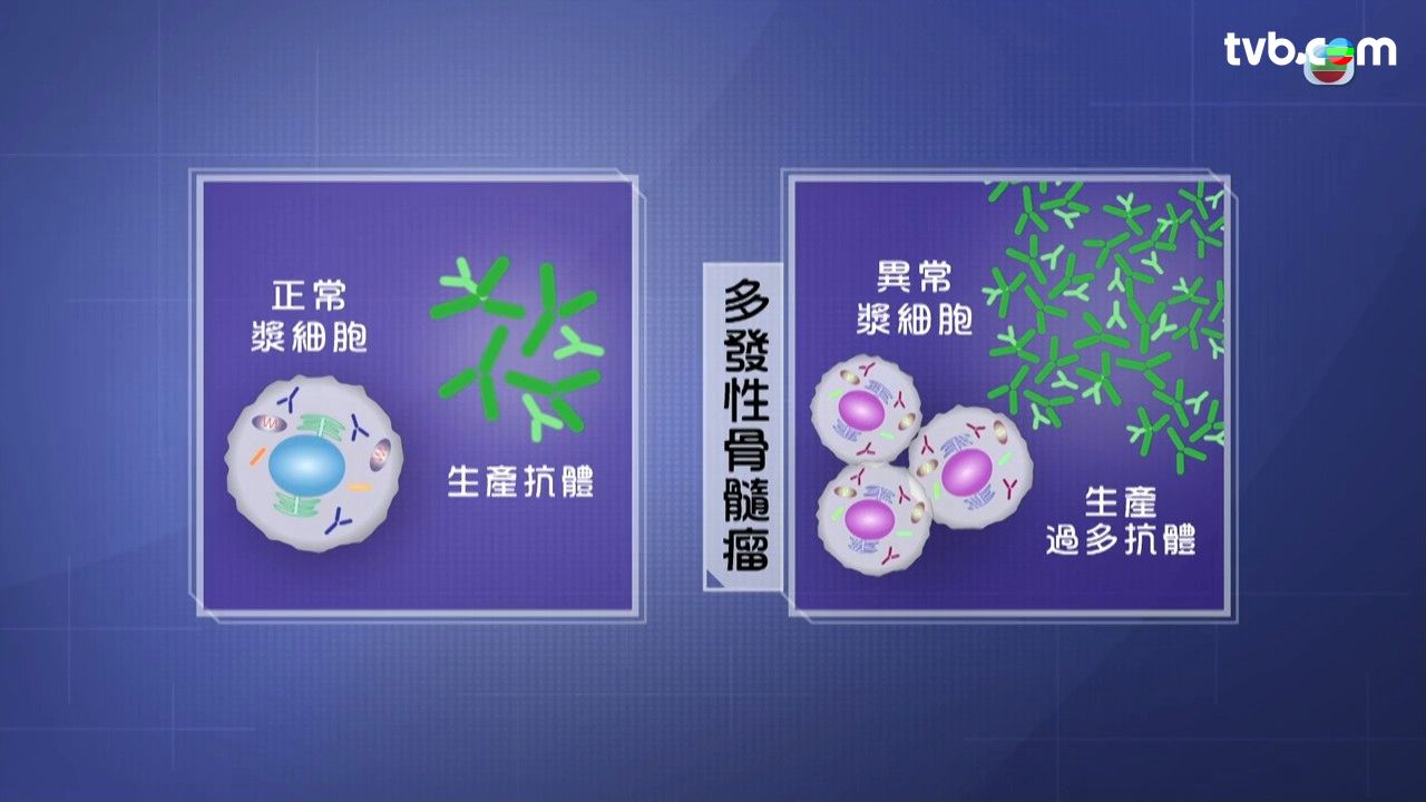 血癌包括白血病、骨髓瘤及淋巴瘤三大類。香港第三常見血癌多發性骨髓瘤是體內的一種白血球,漿細胞異常增生及病變所造成,具體病變成因仍未確定。血液及血液腫瘤科專科醫生鄧凱琪醫生指,漿細胞會分泌不正常的免疫球蛋白,而藏在骨髓內,所以會影響到骨骼,如頭顱、肋骨、盆骨等。