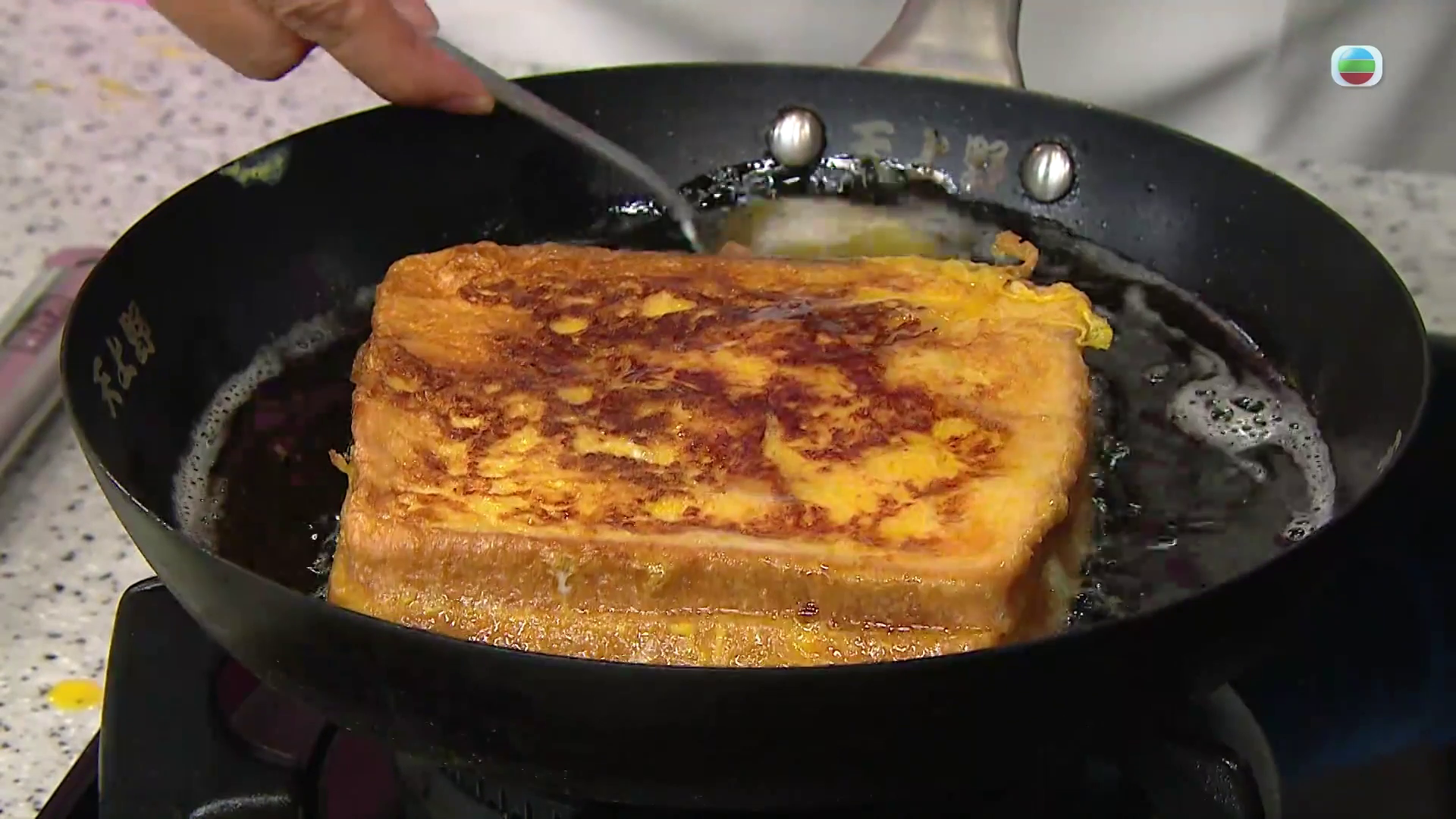 之後在平底鑊裡燒熱六湯匙油,把麵包下鍋以中慢火半煎炸,炸至一面金黃後翻面,之後可以用熱油澆在表面上來使表面燒的更好看。