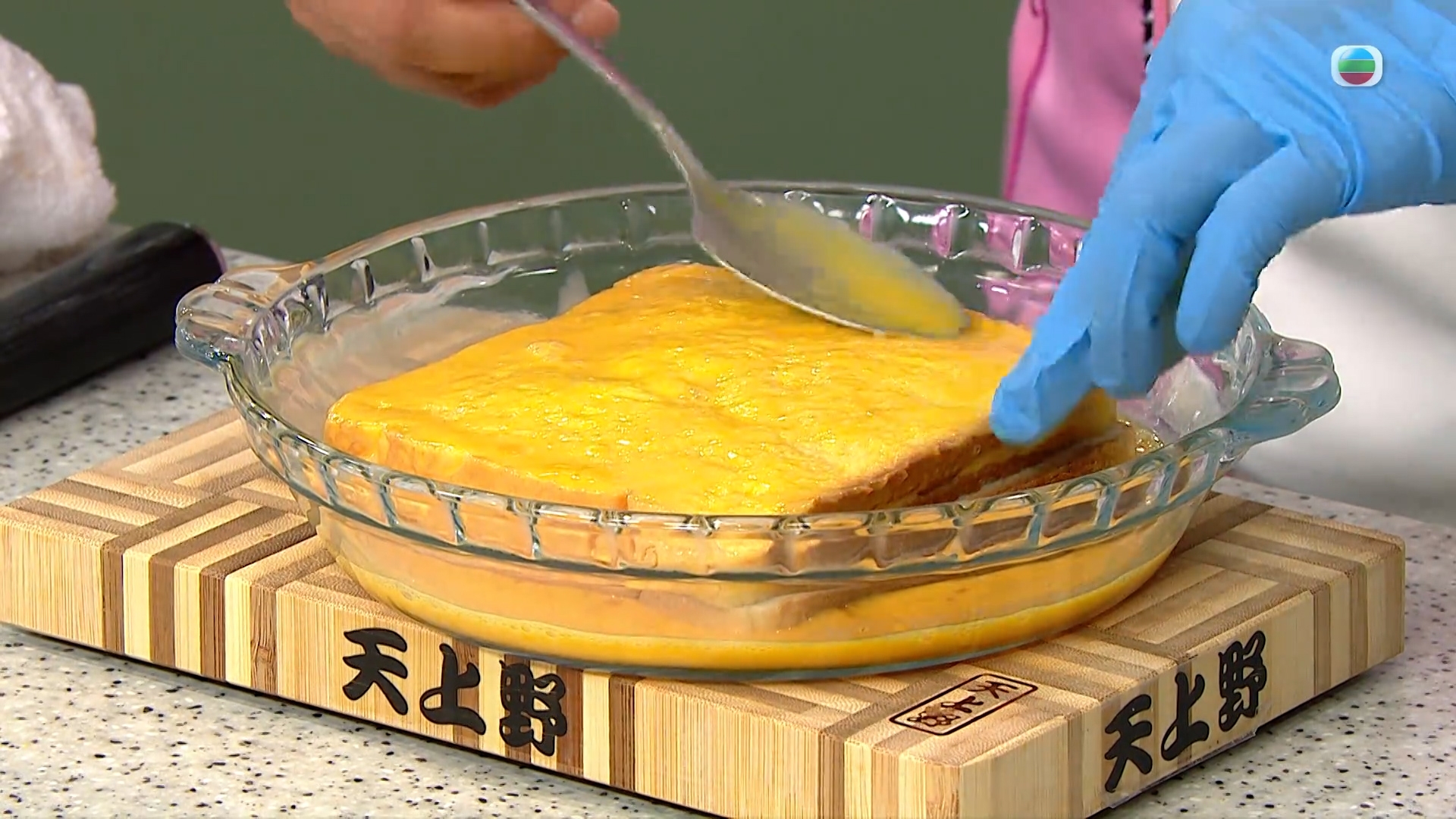 盛蛋汁的碗建議用大的平底碗,Margaret師傅也在蛋汁裡混入淡奶來增加蛋汁裡的水份,淡奶可以用其他奶甚至是清水代替。浸泡時間也可以適量延長,以確保蛋汁能完全滲透進整塊麵包裡。