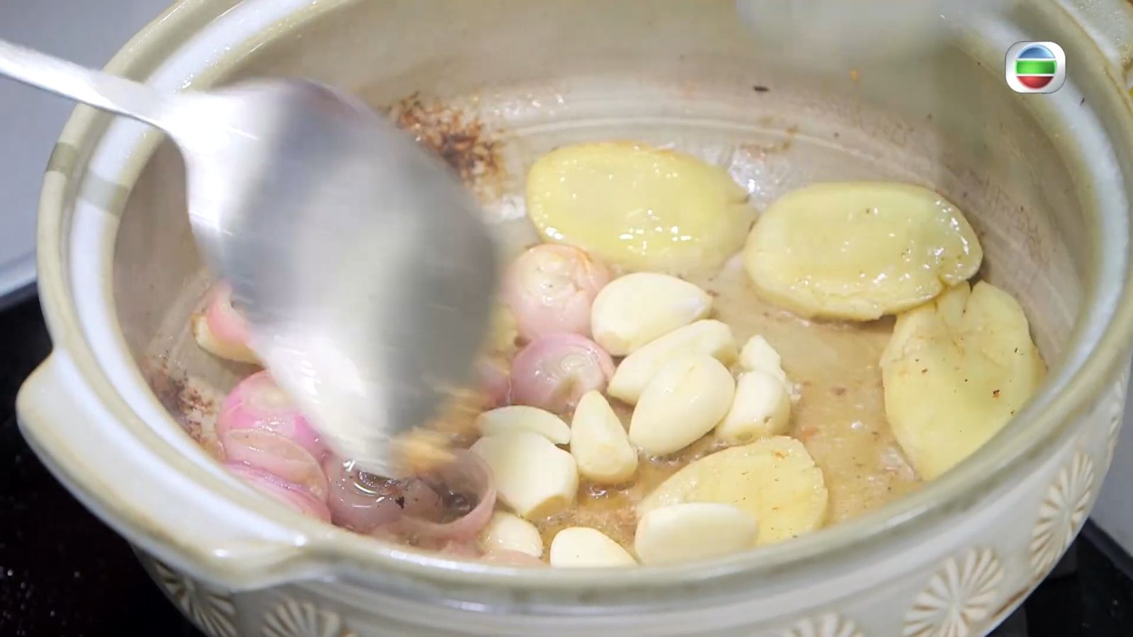 - 砂煲下油,爆香薑、乾蔥、蒜,下火腩,加蓋焗數分鐘。