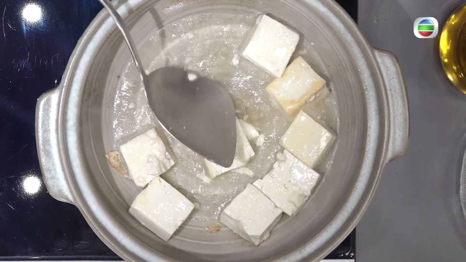 - 先燒熱砂煲,下油,下豆腐煎至四面金黃,再盛起。