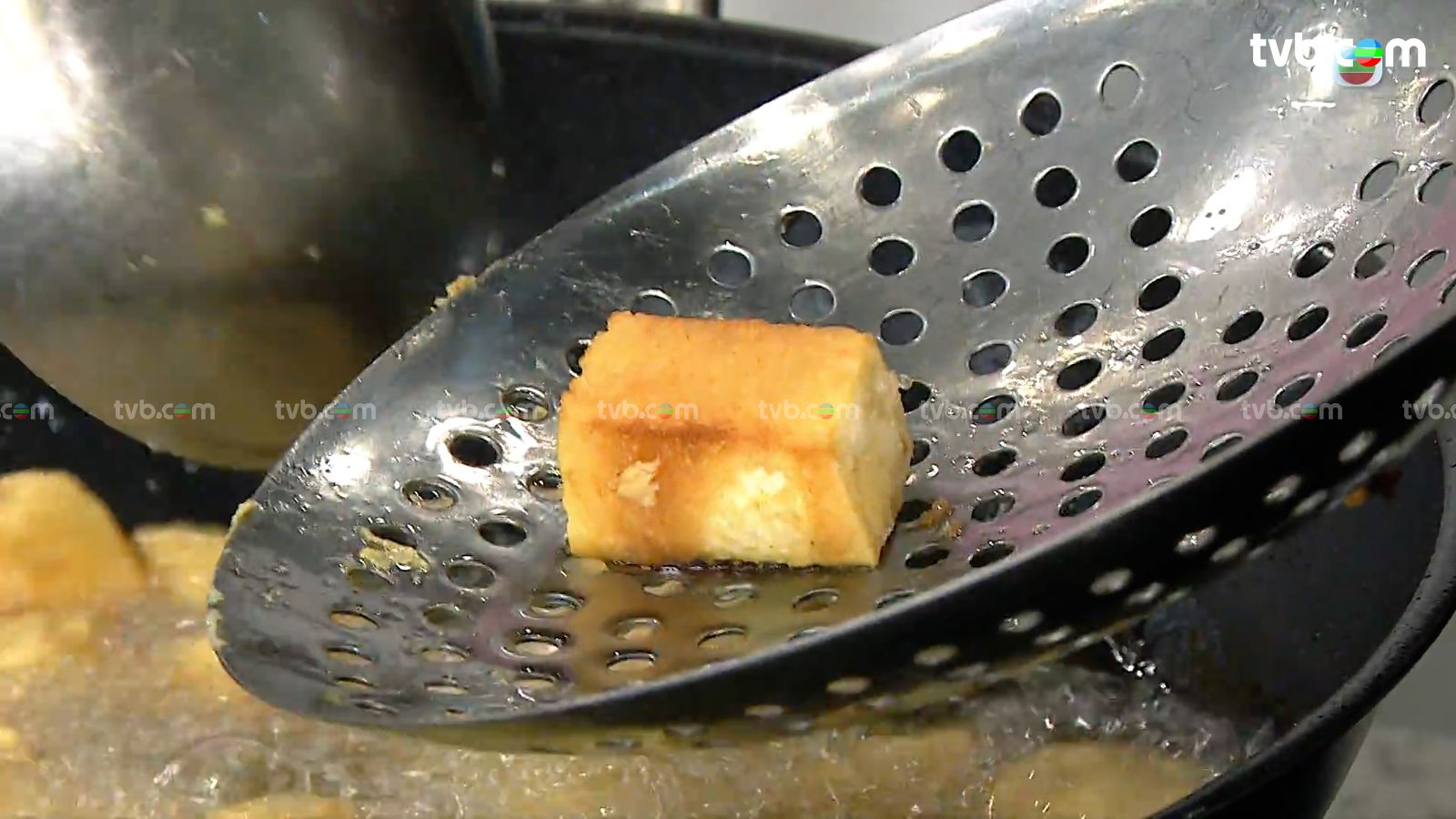 選用的包仔豆腐在街市有售,抹乾水份後切丁,撲少許生粉後下油鍋炸至金黃,置碟備用。