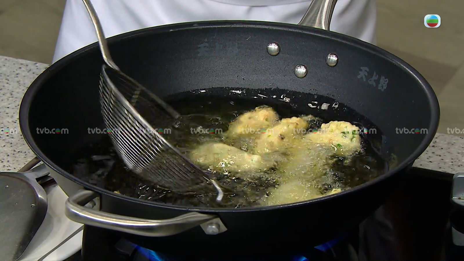 3.油溫燒至攝氏40至50度,用匙羹沾上油,再將已撈好的豆腐釀成琵琶形狀,不停重複以造出約8至12粒琵琶豆腐。轉大火,將琵琶豆腐下鑊逼出油分和炸至金黃色,盛起備用。