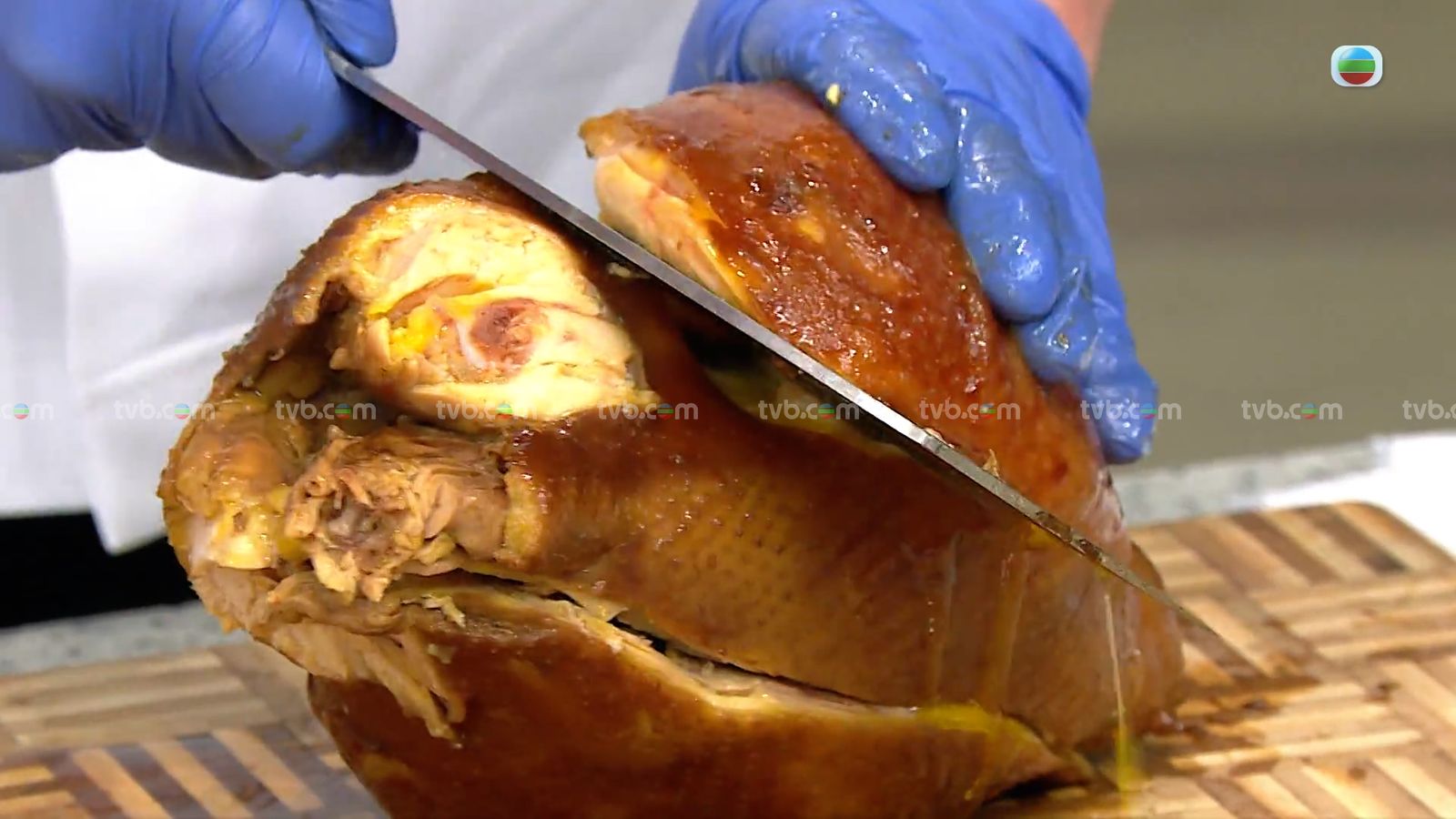 煮好的整雞先斬掉頭,然後開背,再斬出雞翼,之後斬出雞髀,然後把雞胸和雞背分開,最後起出雞背大骨後斬件上碟,具體細節詳見影片Bosco師傅示範。