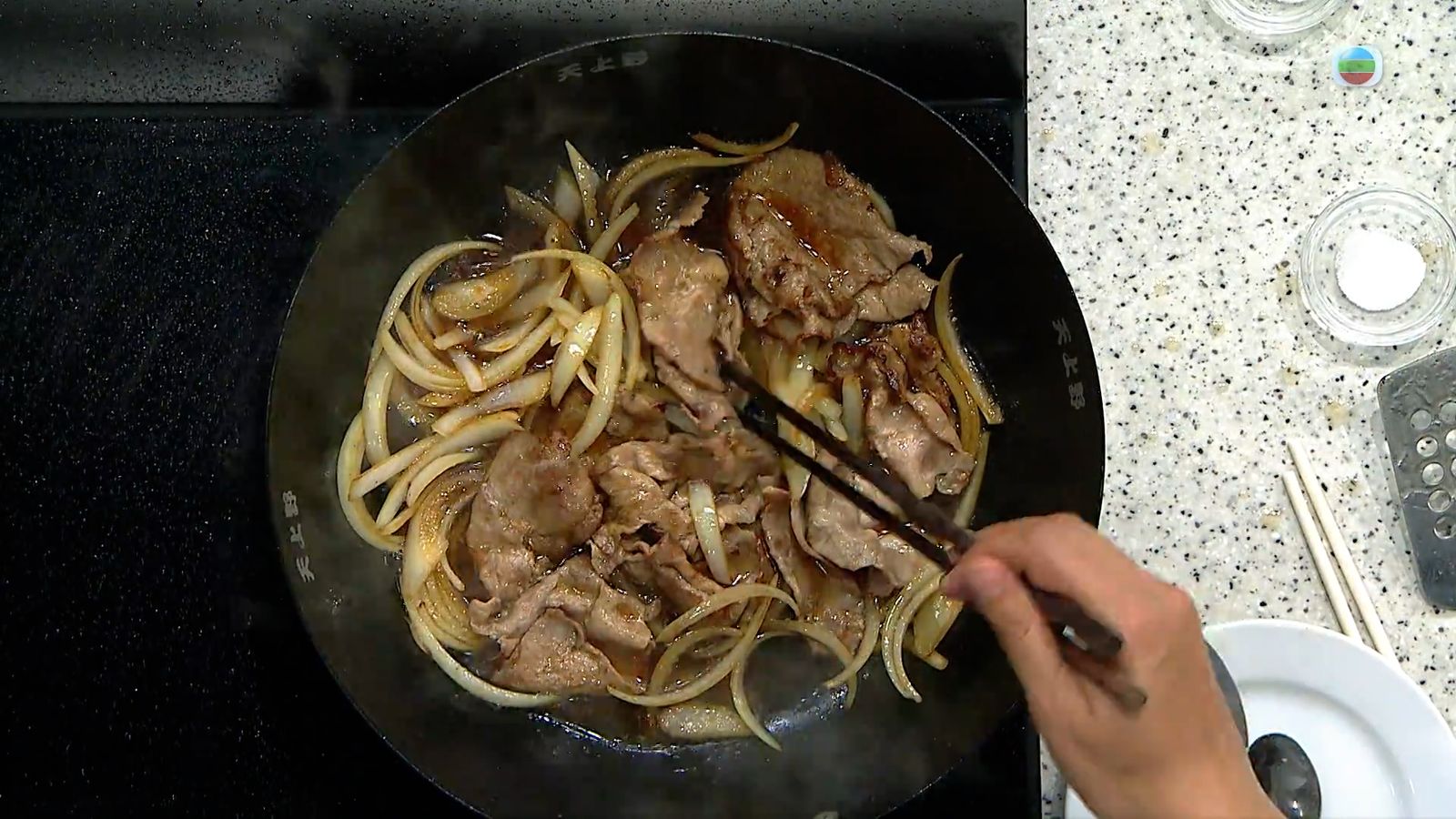 取出豬肉片,原鍋下洋蔥絲炒香,再把豬肉片回鍋,加醬汁和水煮至收汁,加鹽調味後就可以連同白飯上碟。