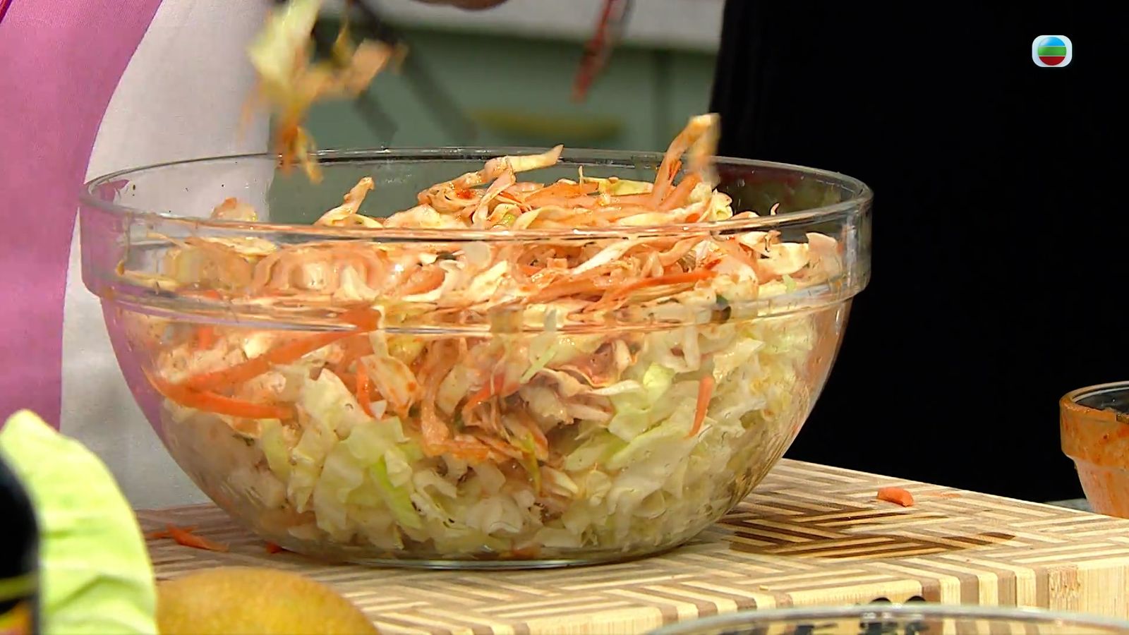 椰菜切幼條, 脫水之後拌入食鹽醃5至10分鐘,再與其他沙律材料拌勻,便成為新鮮的泡菜沙律。