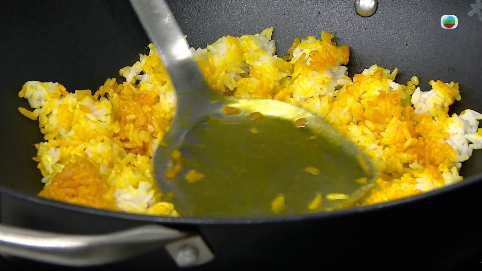 期間另外準備炒飯,起油鍋下洋蔥蓉、黃薑粉爆香,倒入白飯及調味的鹽水,拌炒至飯粒分明備用。