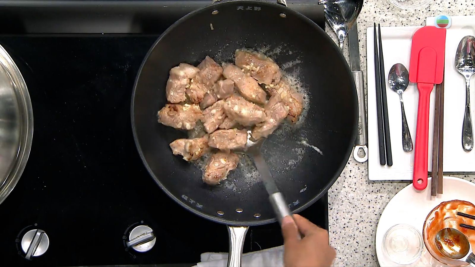 3.用2湯匙油起鑊,燒熱後放入豬軟骨爆香,再加上乾蔥、蒜蓉,倒入(1)混醬繼續煮,上色後才加水至剛蓋好豬軟骨,調小火燜煮,然後加少許生粉水收汁。