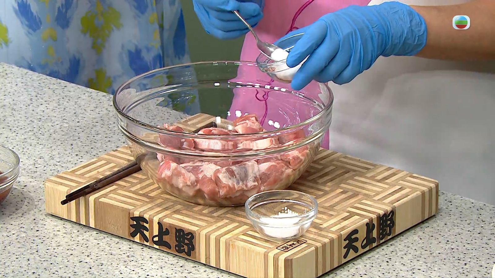 2.豬軟骨加鹽、糖、胡椒粉撈勻調味。