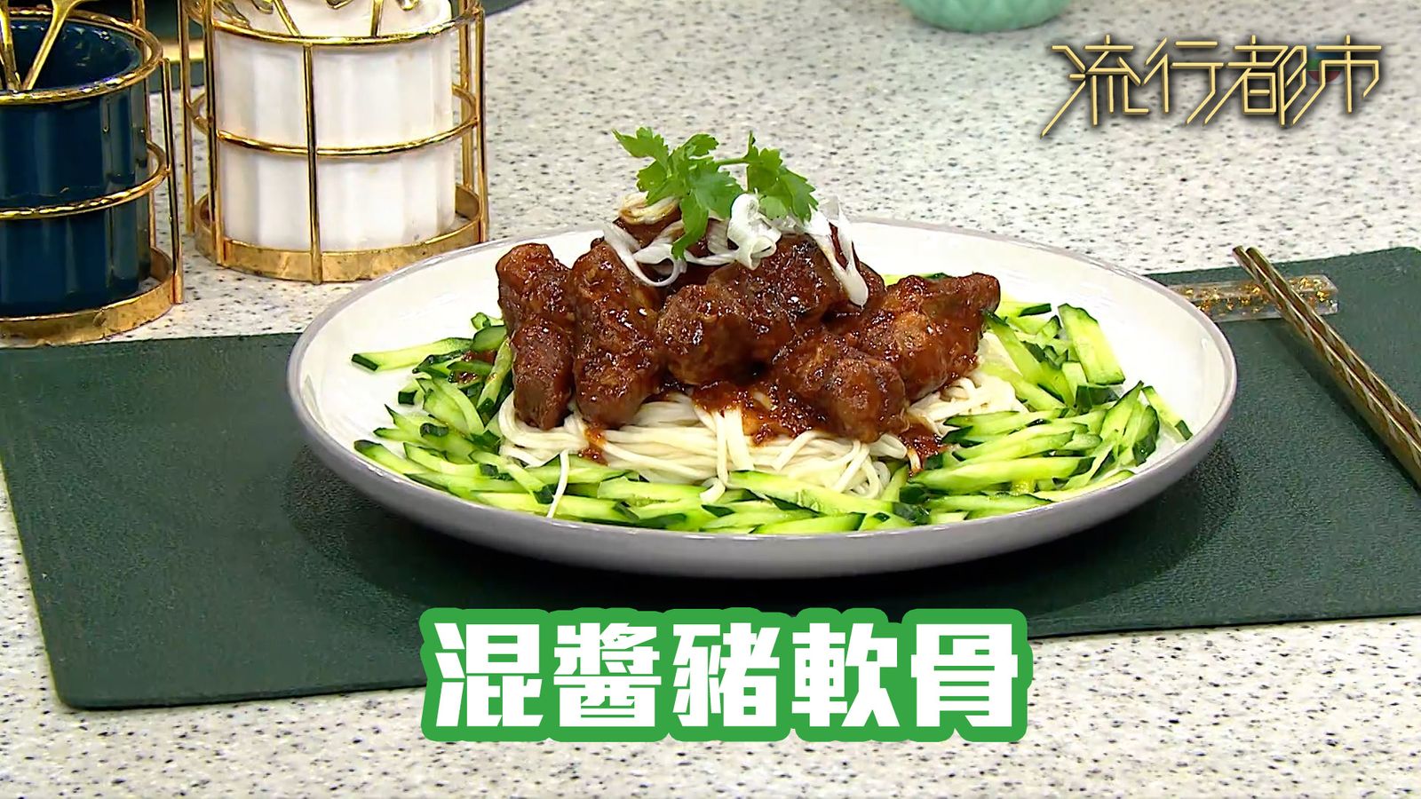 5.碟上以青瓜絲墊底,放上麵條,再擺好豬軟骨,然後淋上醬汁,加京蔥點綴即成。