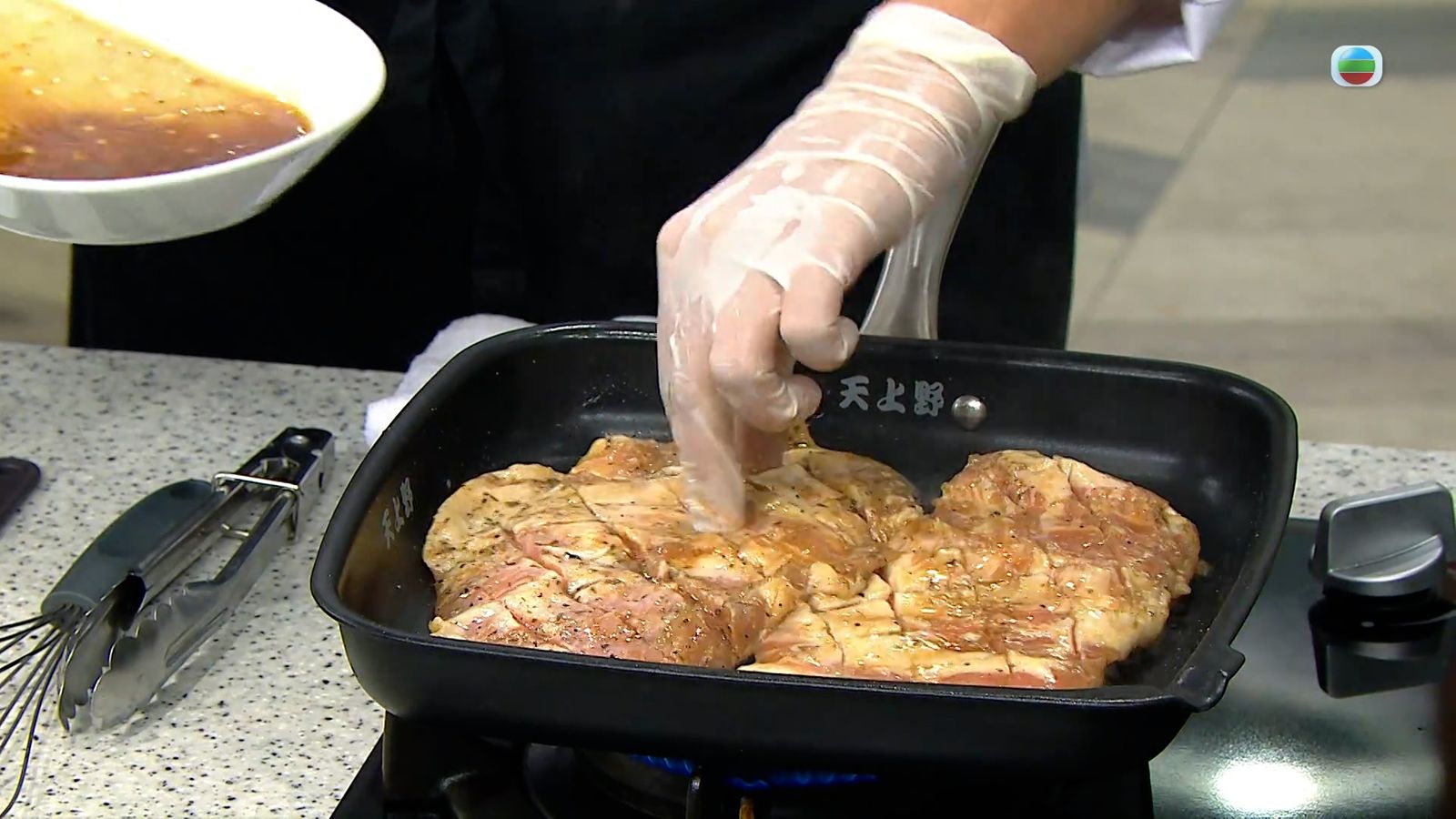 豬頸肉兩面劃幾刀,抹上醃料醃最少1小時,塗上食油後放入預熱好的坑紋鍋烤熟,切片備用。