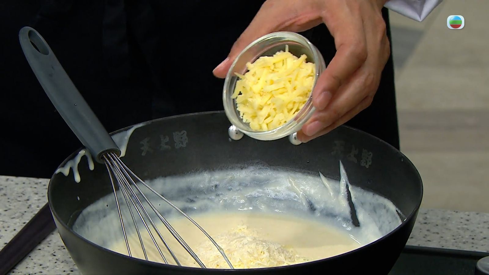 3.鍋內煮溶牛油,伴入麵粉拌勻成麵糊,然後拌入牛奶,以慢火邊煮邊用蛋拂攪拌至白汁順滑及濃稠,再拌入白味噌及芝士碎,成「芝士白汁」備用。