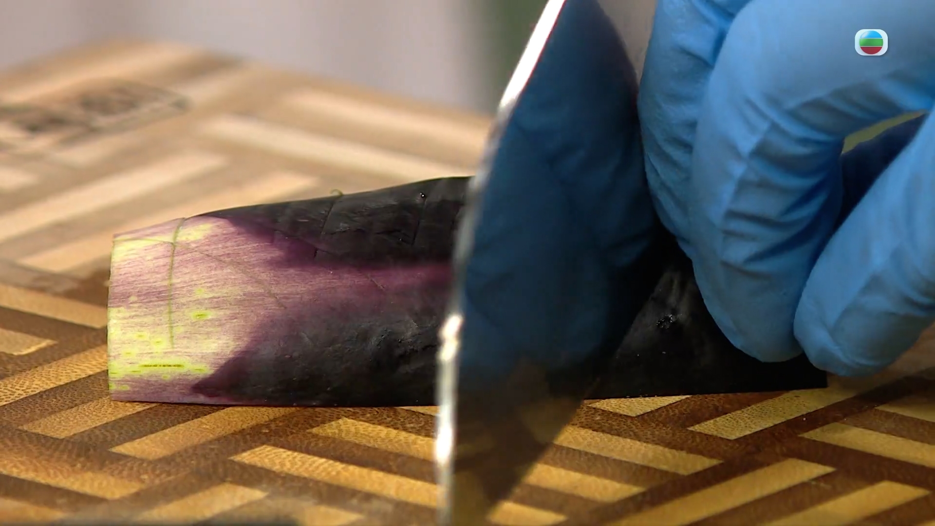 茄子切件後在正背兩面划上花刀,一來更美觀,二來更好入味,划好花刀之後鹽醃半小時,擠出水份,然後下油鍋煎至兩面金黃就可以拿出備用。