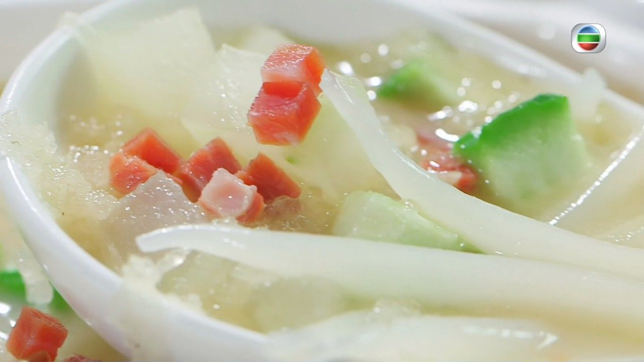 - 用篩隔去魚及洋蔥絲,把魚湯回鑊煮滾,放入冬瓜粒、金華火腿粒、大地魚粉、鹽、胡椒粉