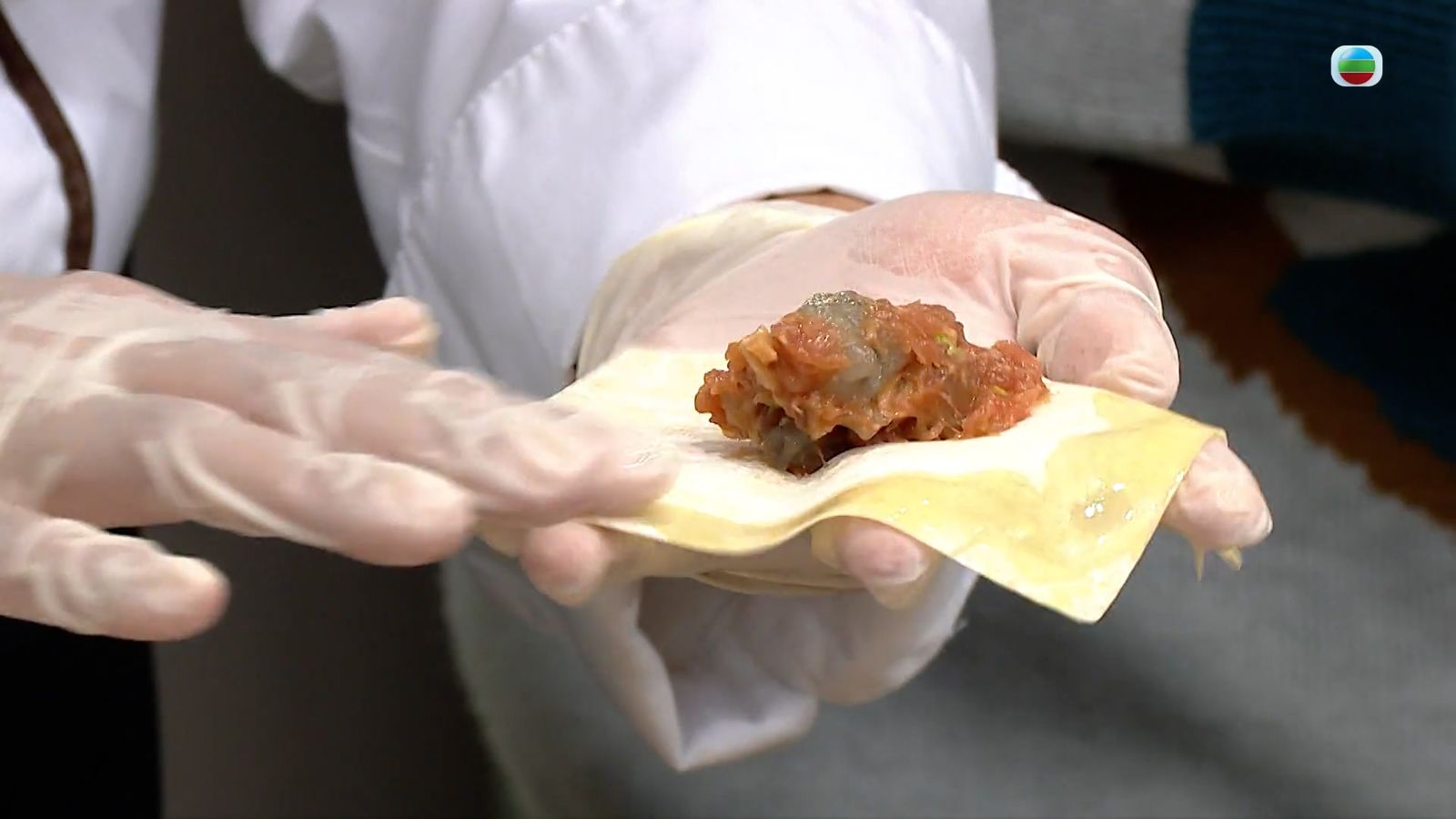6.雲吞材料與調味料攪拌至黏稠,麻油後下,再將適當份量釀入每塊雲吞皮內,邊口位置掃少許水封口。