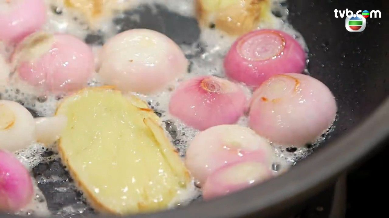- 另起新鍋,熱鍋下油,放薑、蔥頭煎香後放入蒜頭、豆豉醬、雞件,拌勻後加入(4)的煮雞用醬汁及原粒豆豉,煮一煮至雞肉熟透
