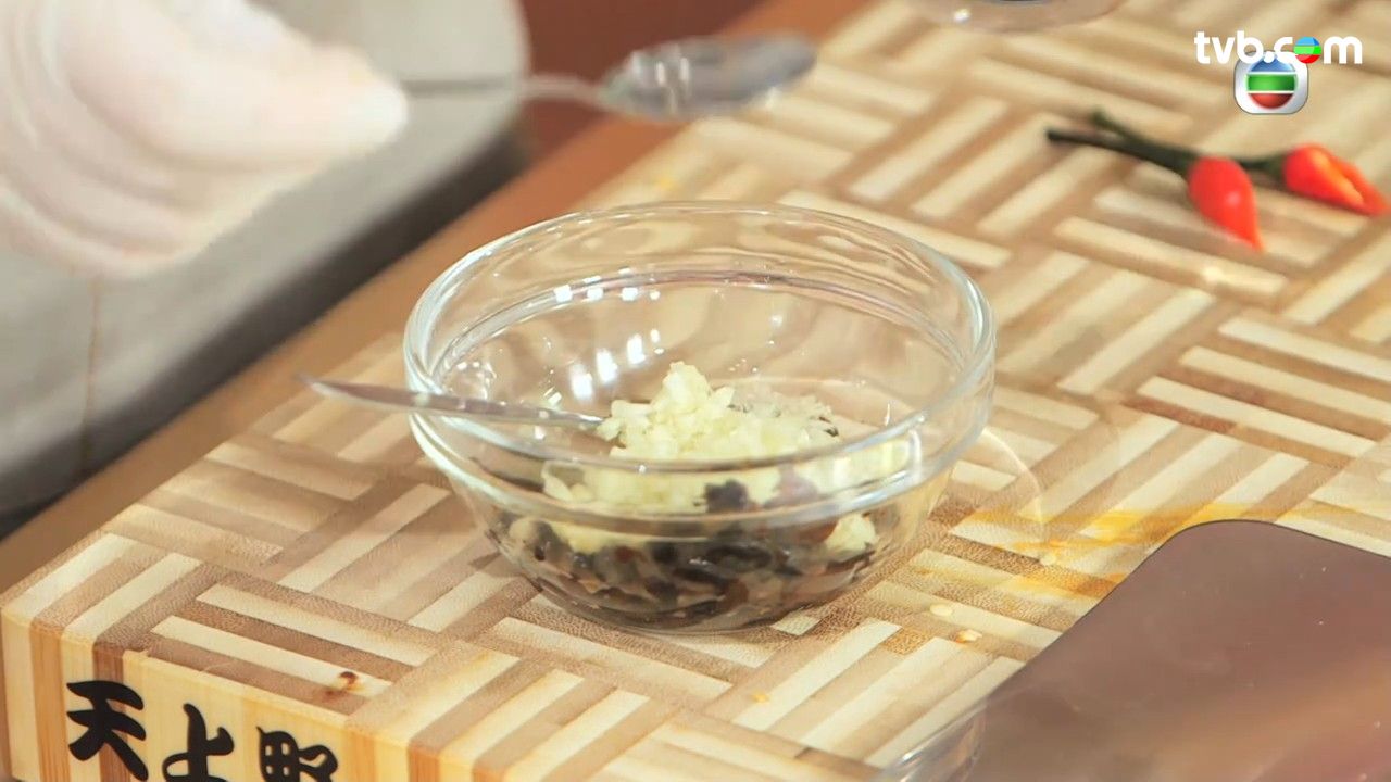- 把豆豉壓成醬,加入糖、蒜蓉、玫瑰露酒,成為豆豉醬