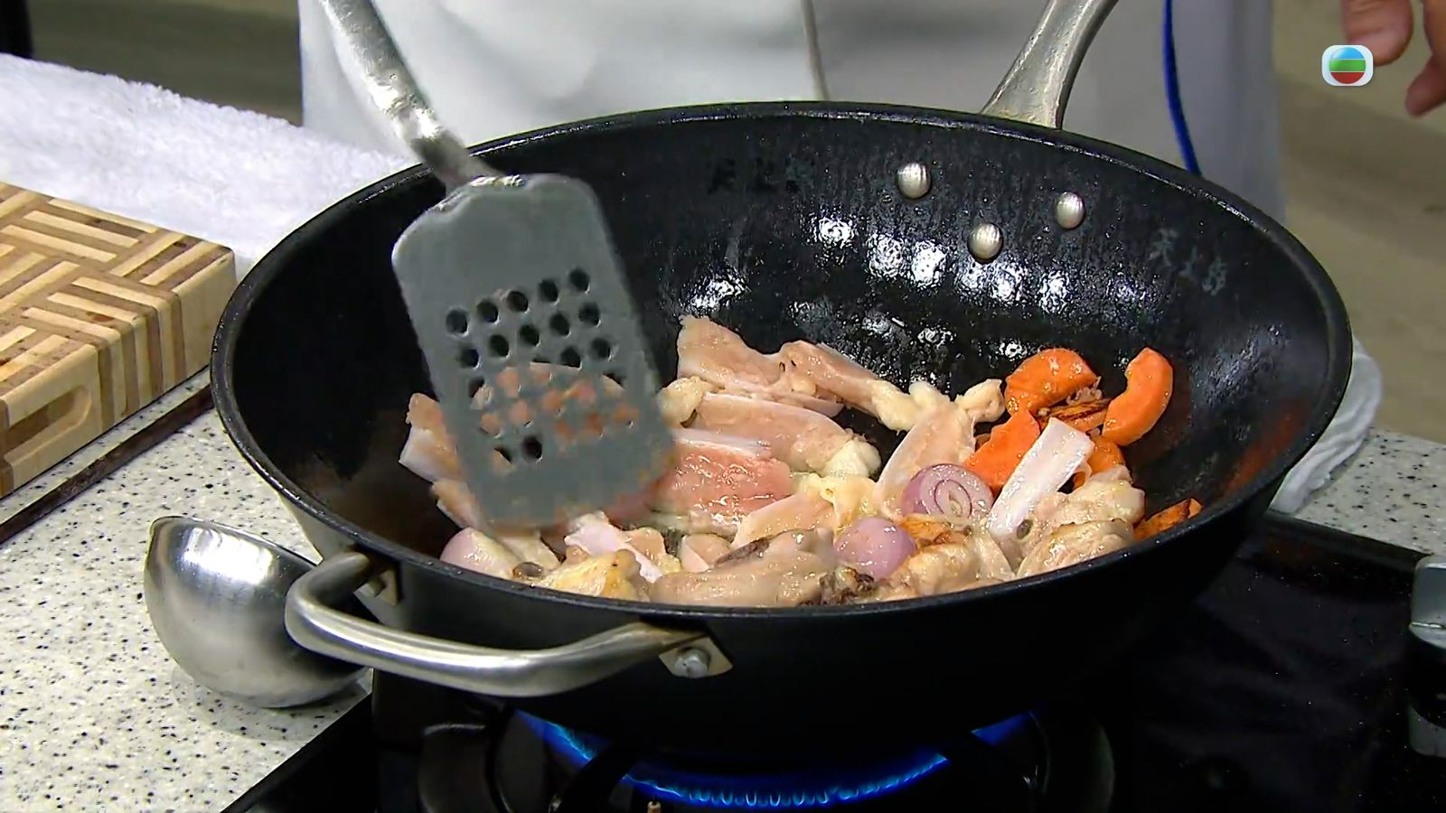 雞件用鹽跟生粉略醃,雞軟骨只用鹽醃即可。起油鍋後先煎香雞件,再下胡椒粒、甘筍片、乾蔥、蒜頭,然後下雞軟骨煎香,灒煮食酒。